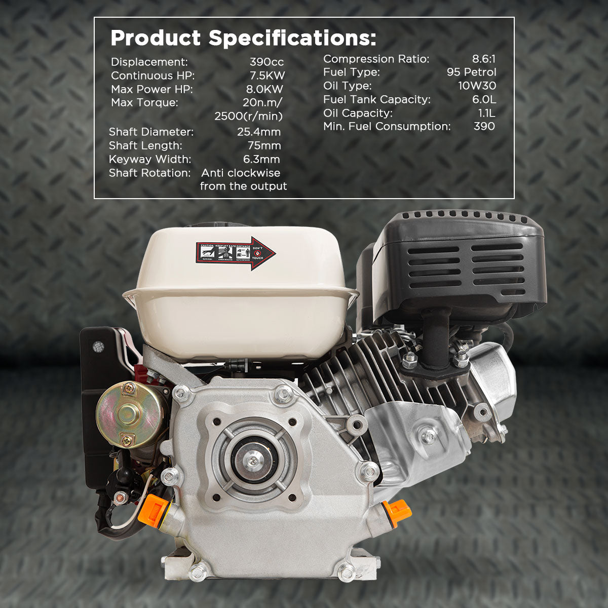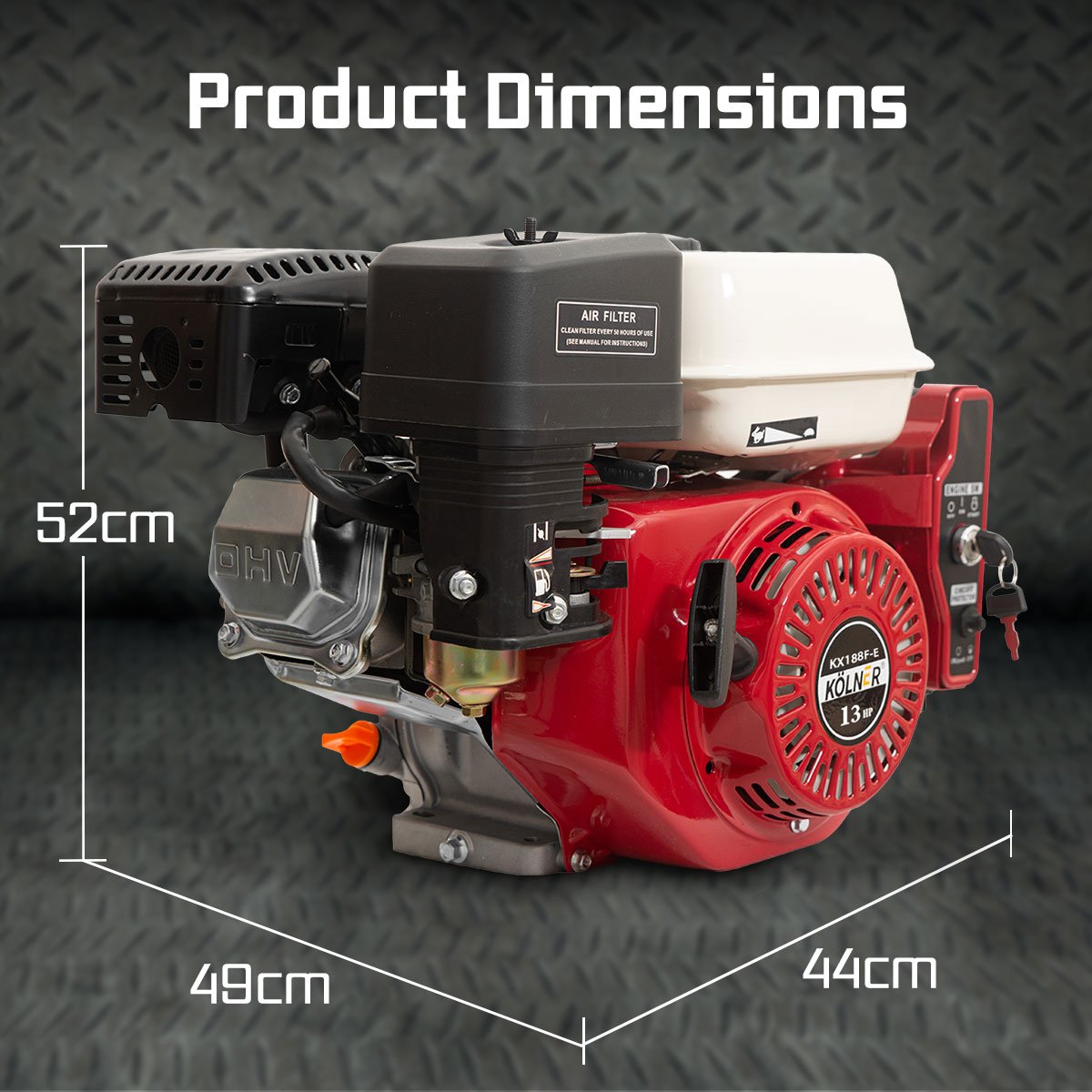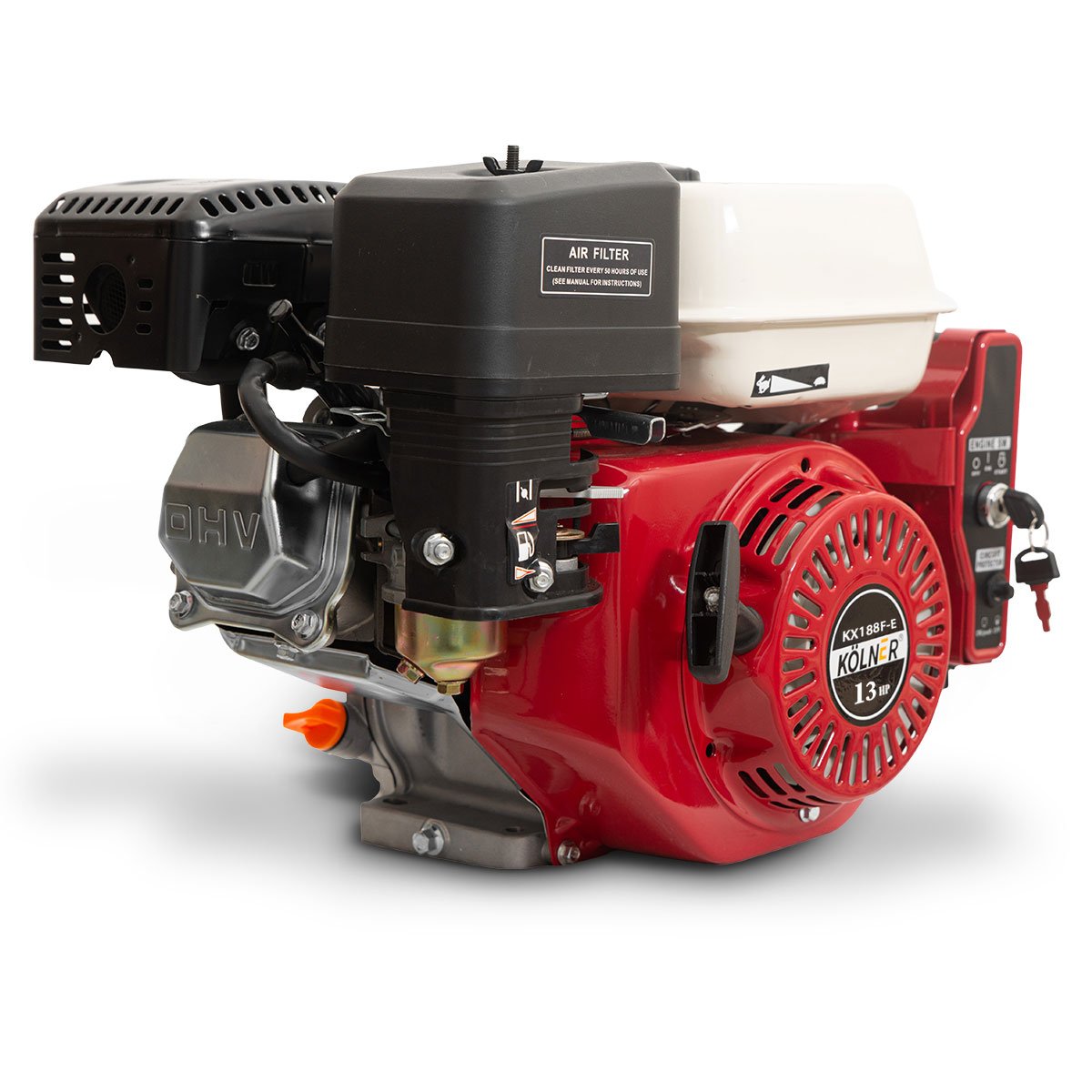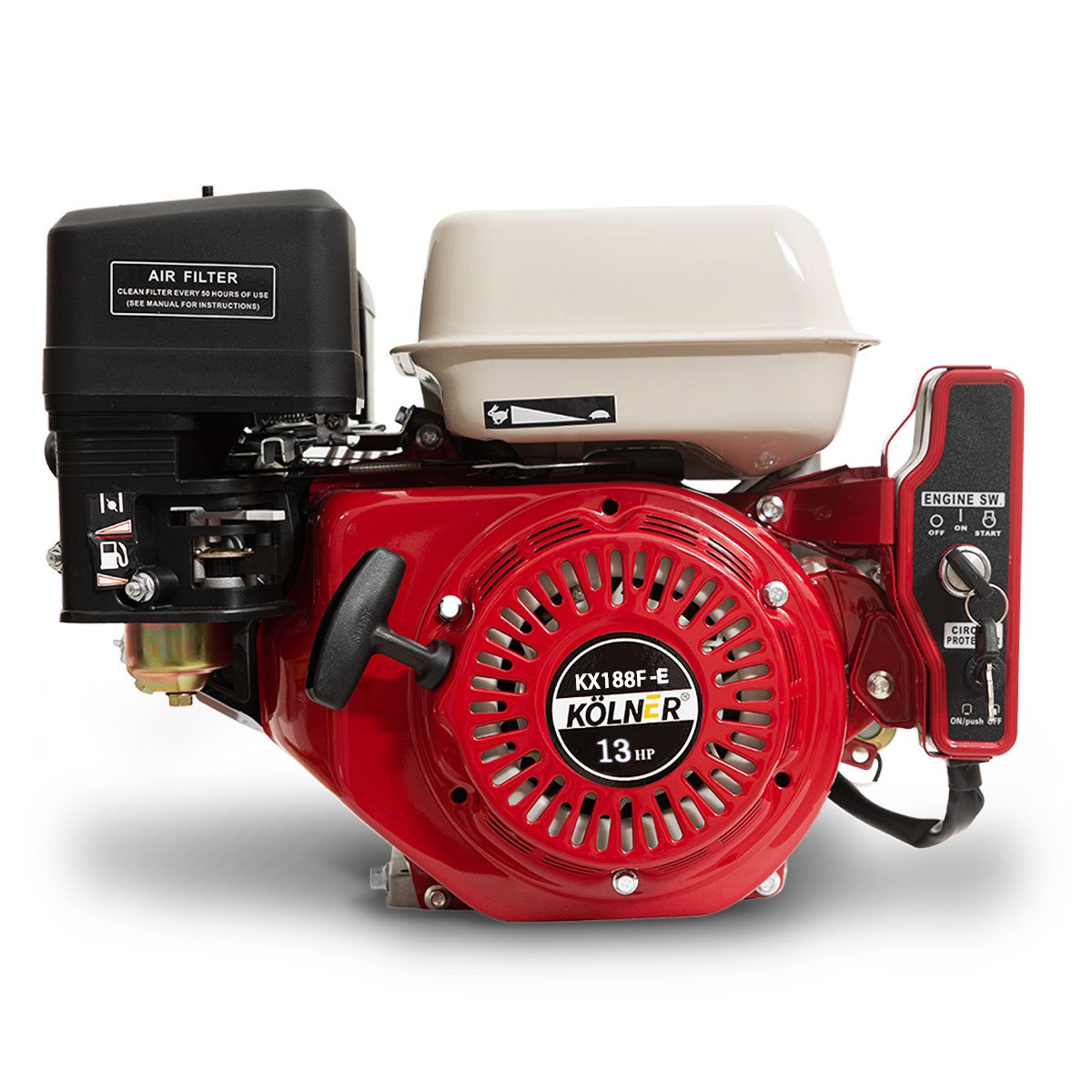 This powerful 13HP Kolner electric key start engine will suit a multitude of uses whether your application is industrial, agricultural or domestic usage. This engine can be used to power any equipment including generators, water pumps, air compressors, log splitters, high-pressure cleaners, go-karts and a wide range of other construction and agricultural equipment.