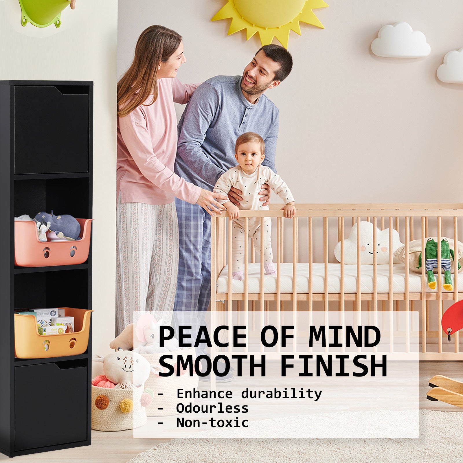 Not least, the 4 tiers of storage cabinet is made of environmental-friendly wood covered with melamine finish for extra durability. Plus, this product is made from a non-toxic chemical keeping the safety of your family in mind.