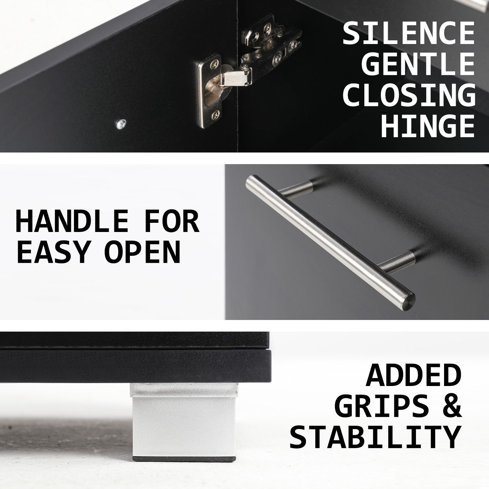 There are two smooth drawers on top and a two-tier cabinet below, the door comes with magnetic door catches and soft-closing hinges which ensure the door closes tightly and gently.
