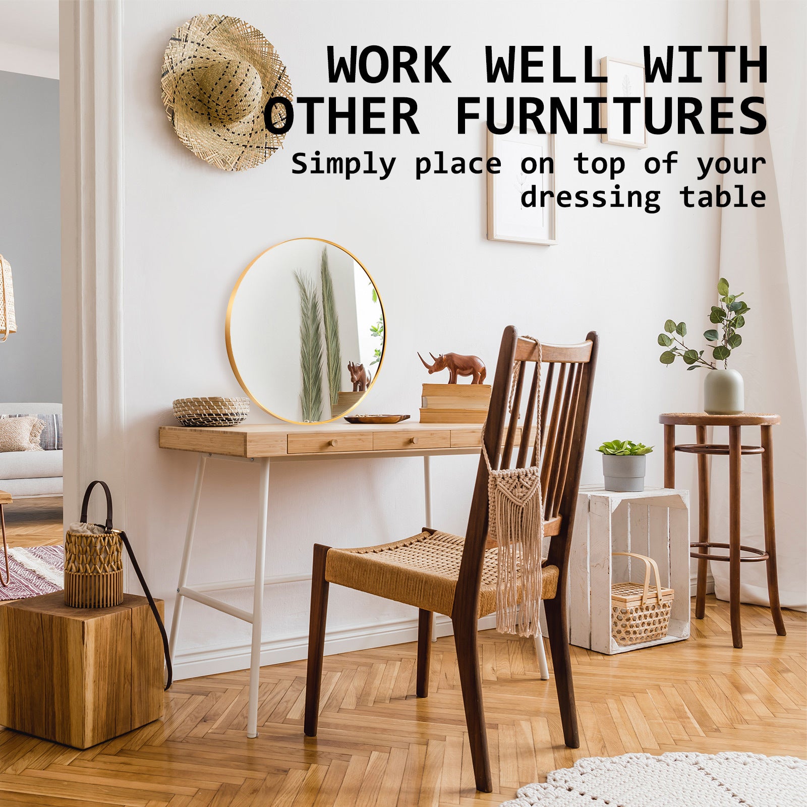 The round mirror is modern and clean in design comes with a 3.9cm thickness minimalistic aluminum frame that is sure to capture the attention of all. Plus, its curved lines all rounds will become a central focal point in any room which makes spaces feel more inviting and relaxing.