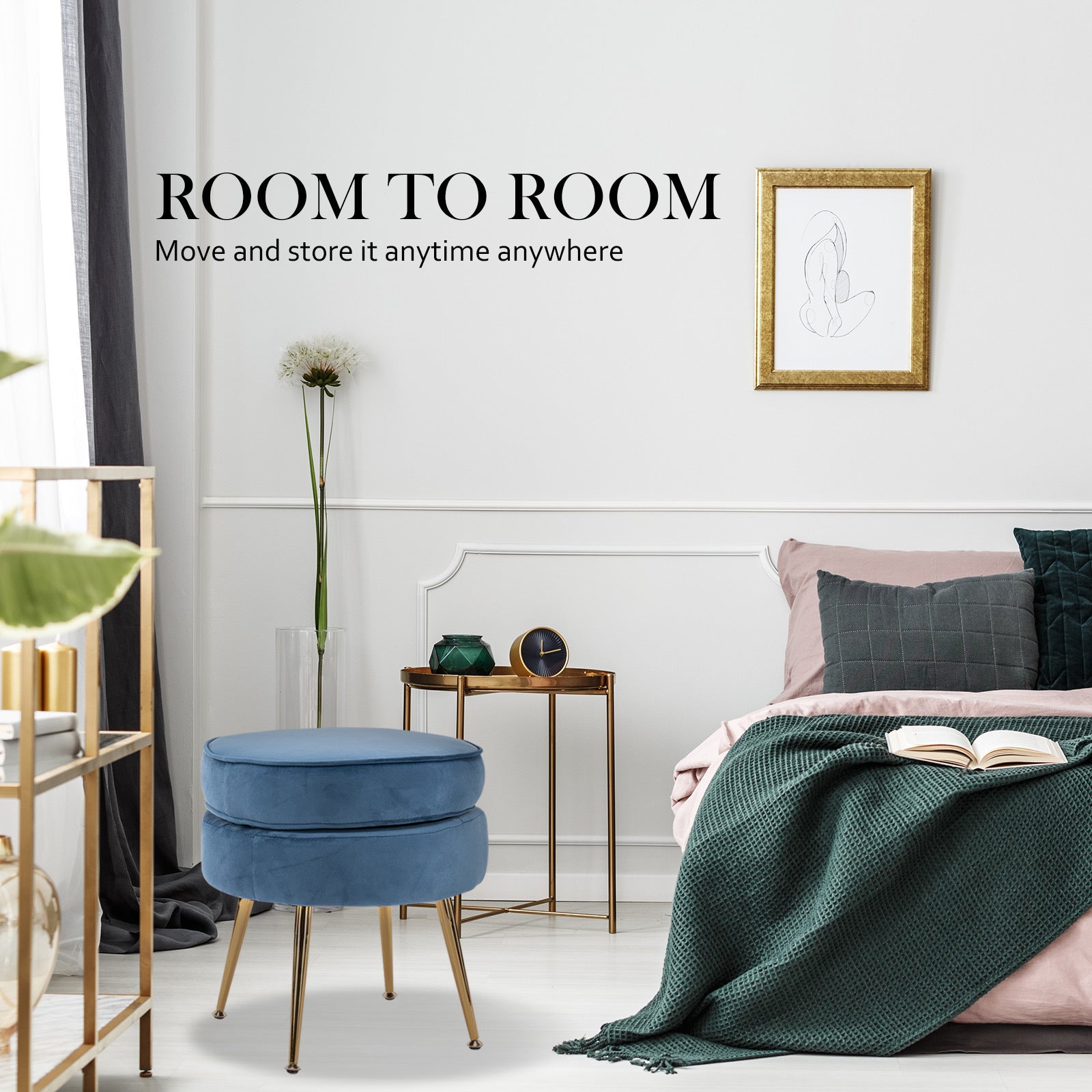 La Bella Ottoman Foot Stool Velvet Fabric Metal Leg Round - Navy Blue