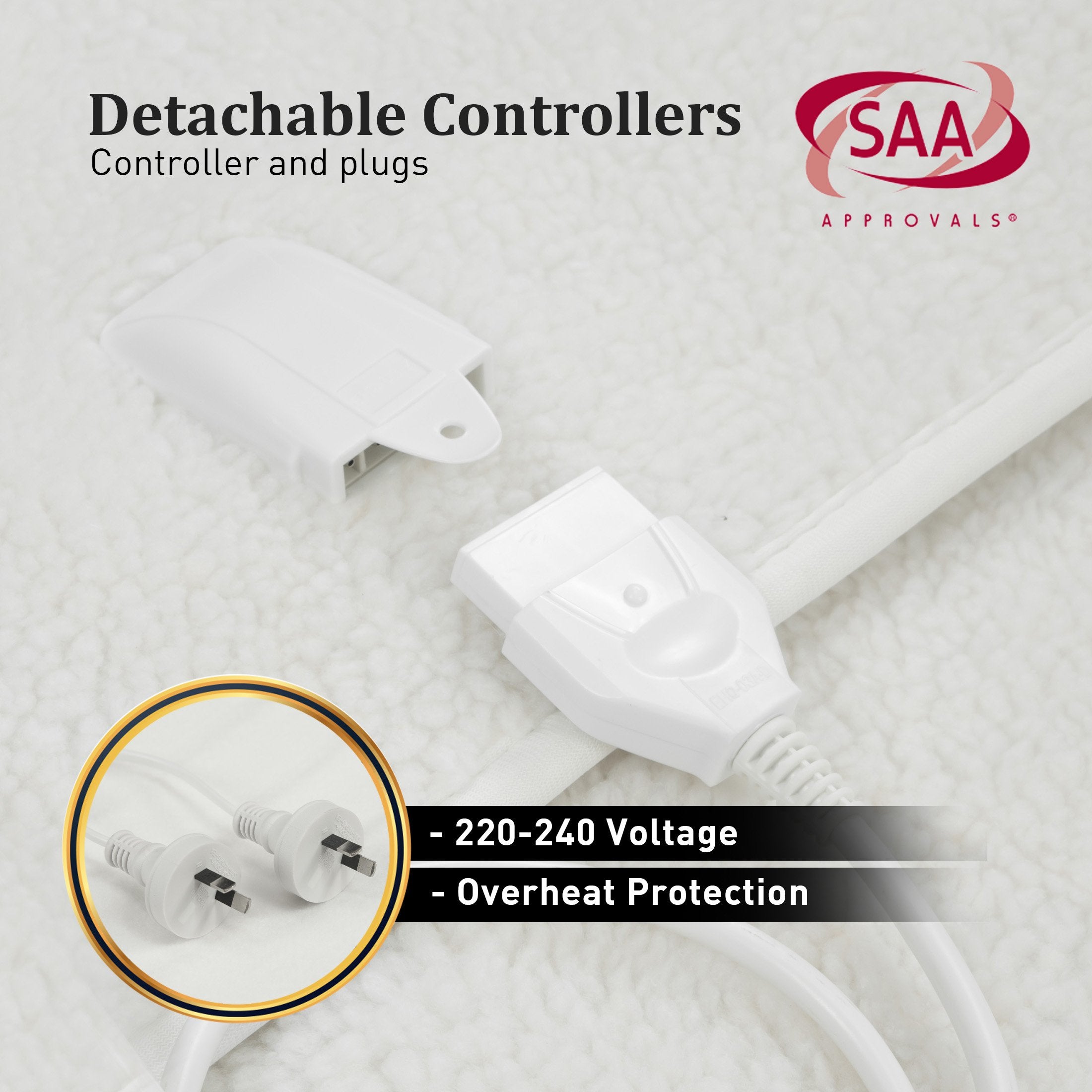 This single-size electric blanket fits over your bed to provide wonderful warmth. It is made with ultra-soft, synthetic wool fabric to give you the ultimate cosy feeling. It is safe and easy to use, with overheat protection and an SAA-approved cable and plug.
