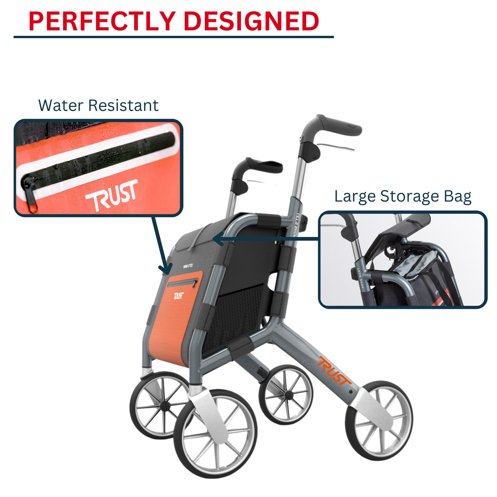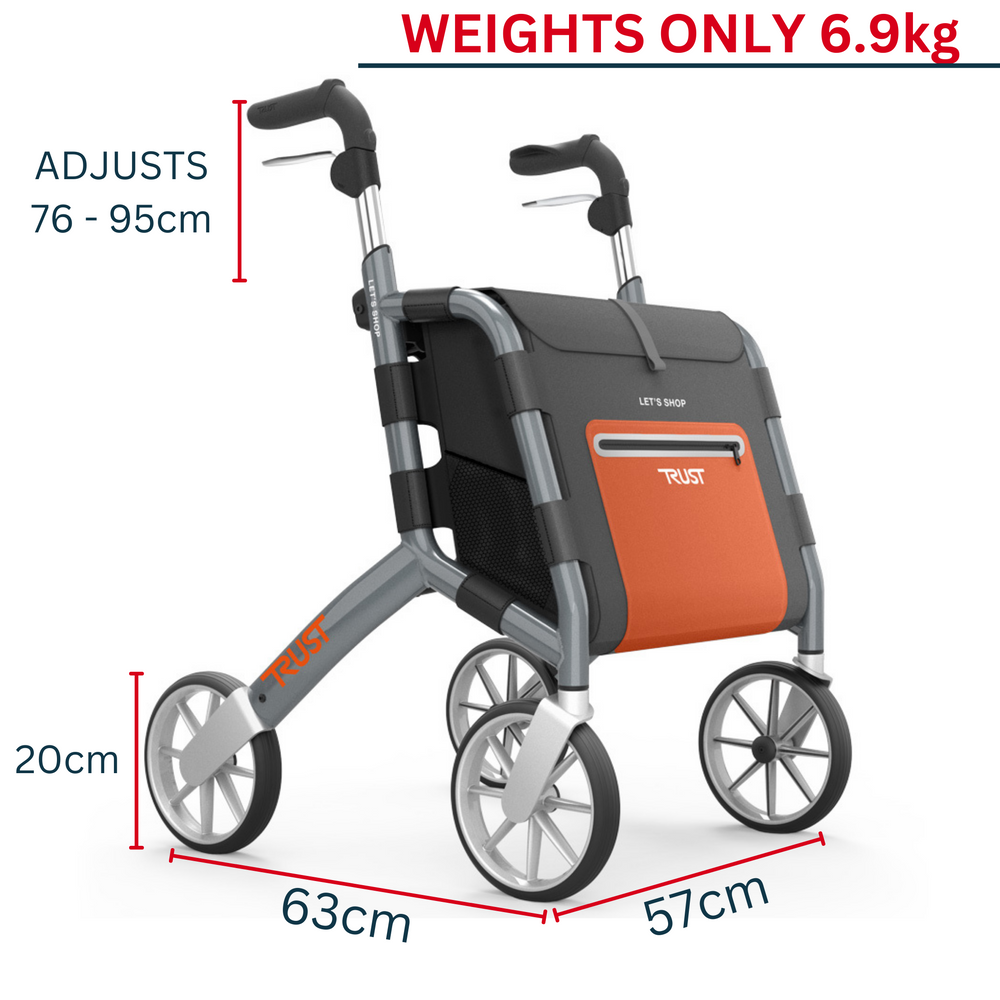 Makes it easier for you to transport your things, where ever you go - quick, easy and safe. This lightweight aluminum rollator is equipped with a large shopping bag that helps you transport all types of things and personal belongings.