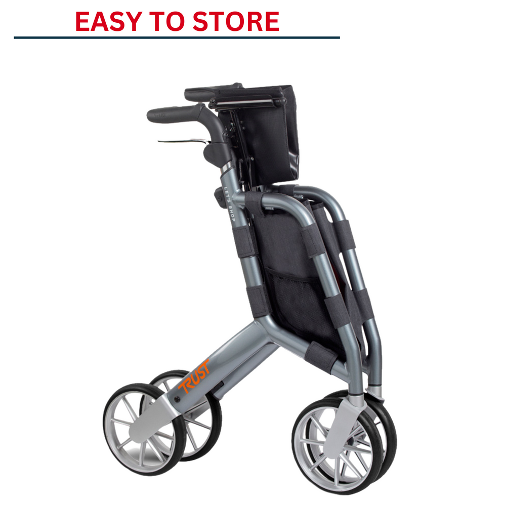 Let's Shop has ergonomically designed rubber handles that are easy to adjust between 76 cm and 95 cm to fit your height. The rollator is also foldable and can stand by itself when folded. This makes it easier to store it or take it with you when traveling. Let's Shop comes in two different colors, Graphite Gray and Black. Different accessories are available, like backrest bands, travel bags, and lamps.