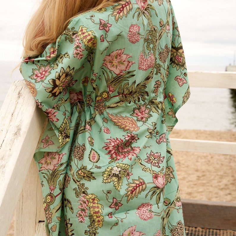 Linen Connections Cotton Kaftan Kimono Cotton Dress Caridgan Maxi Dress Mother's Day Gift Maternity Gown Floral Print Gift for her | Green