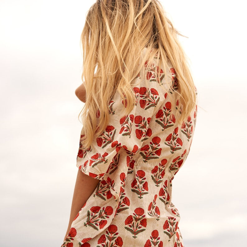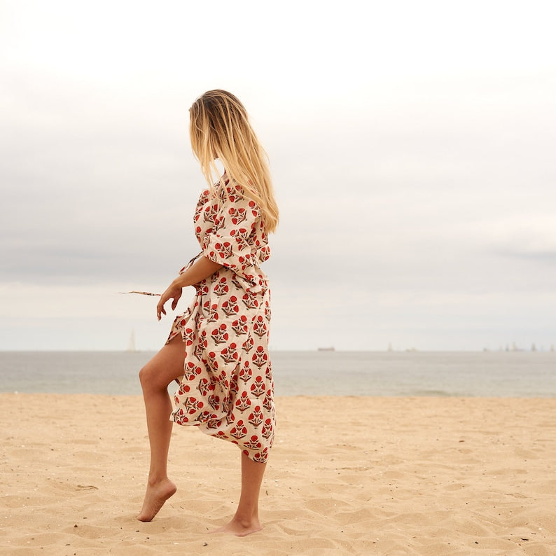 Linen Connections Cotton Kaftan Kimono Robe Mother's Day Gift Maxi Dress Maternity Gown Block Print Floral Gift for her | Red