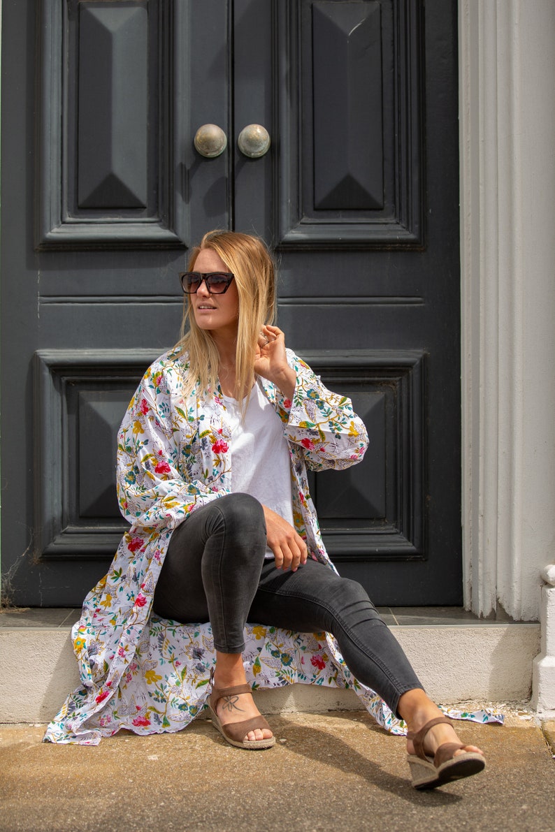A beautiful Frida Kahlo inspired kimono robe for a super price. Perfect as a kimono, robe or a kaftan. Made from super comfy light weight cotton cambric so treat yourself to ultimate comfort whether you are simply winding up at night, getting ready for the morning or just cozying up in your lounge to binge watch a move on Netflix.