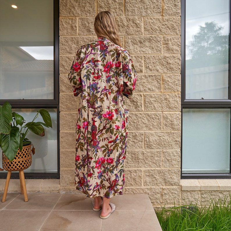 A beautiful Frida Kahlo inspired kimono robe for a super price. Perfect as a kimono, robe or a kaftan. Made from super comfy light weight cotton cambric so treat yourself to ultimate comfort whether you are simply winding up at night, getting ready for the morning or just cozying up in your lounge to binge watch a move on Netflix.