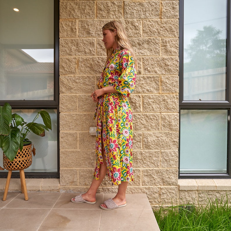 A beautiful Frida Kahlo inspired kimono robe for a super price. Perfect as a kimono, robe or a kaftan. Made from super comfy light weight cotton cambric so treat yourself to ultimate comfort whether you are simply winding up at night, getting ready for the morning or just cozying up in your lounge to binge watch a move on Netflix.