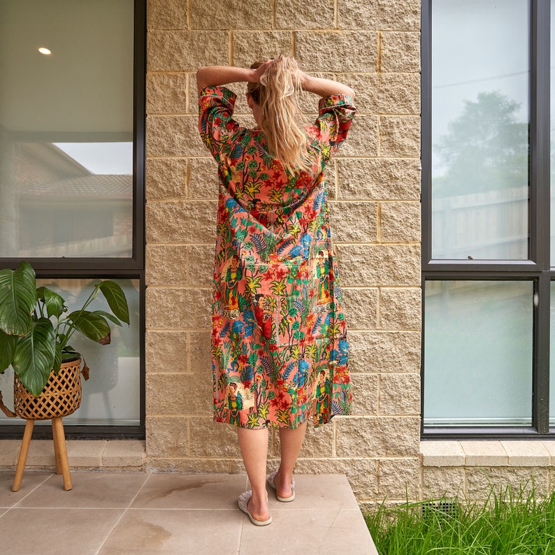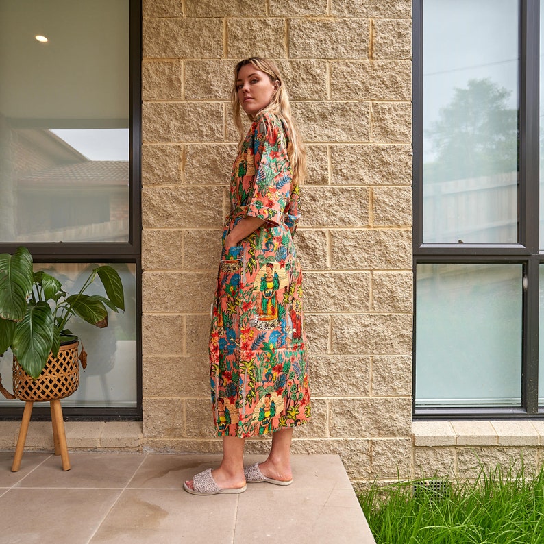 A beautiful Frida Kahlo inspired kimono robe for a super price. Perfect as a kimono, robe or a kaftan. Made from super comfy light weight cotton cambric so treat yourself to ultimate comfort whether you are simply winding up at night, getting ready for the morning or just cozying up in your lounge to binge watch a move on Netflix.