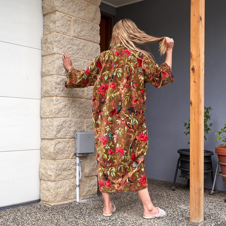 A beautiful Frida Kahlo inspired kimono robe for a super price. Perfect as a kimono, robe or a kaftan. Made from super comfy cotton velvet so treat yourself to ultimate comfort whether you are simply winding up at night, getting ready for the morning or just cozying up in your lounge to binge watch a move on Netflix.