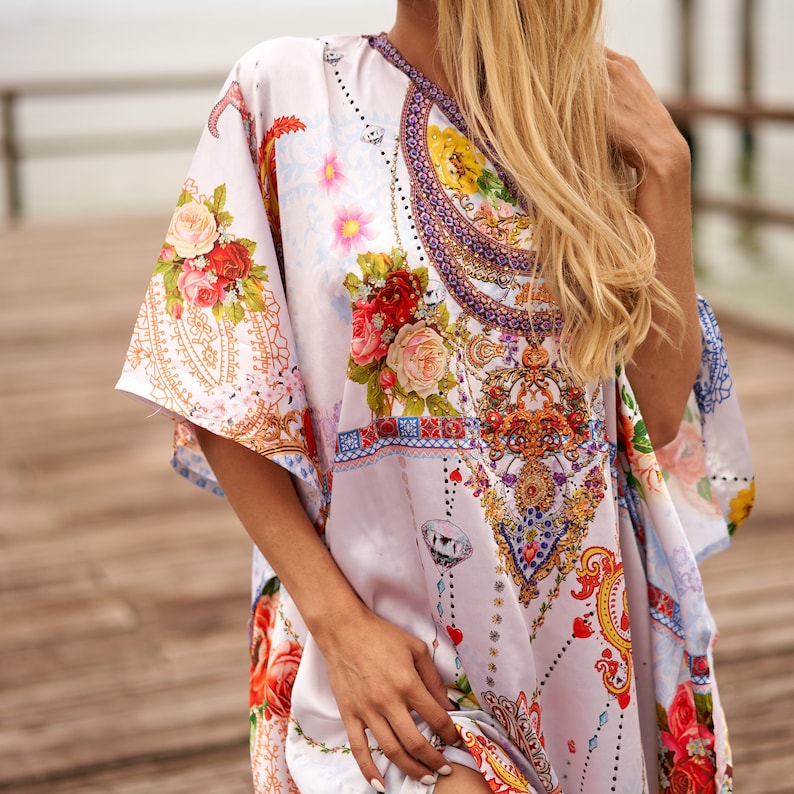 Linen Connections Trendy Silk Kaftan For Women Long Caftan Resort Wear Vacation Beach Dress Boho Silk Dress Kaftan Floral Print Silk Kaftan Gift For Her | Light Purple