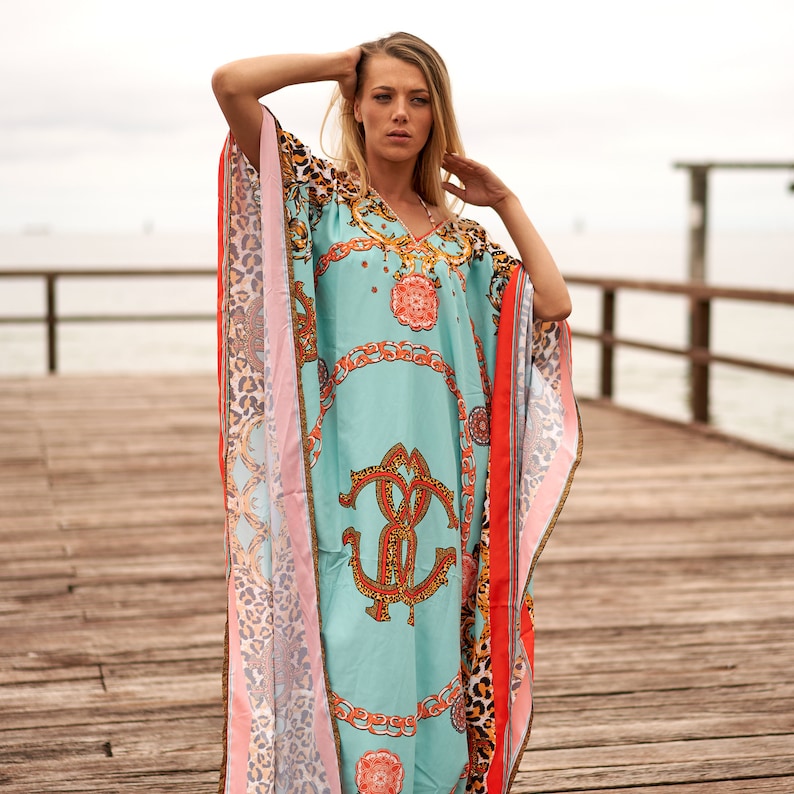 Linen Connections Trendy Silk Kaftan For Women Long Kaftan Resort Wear Vacation Beach Dress Boho Silk Dress Beautiful Ptint Kaftan Gift For Her | Ultramarine Green