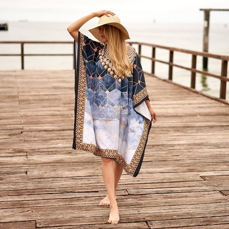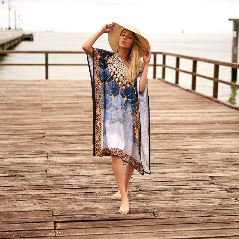 Linen Connections Trendy Silk Kaftan For Women Long Kaftan Resort Wear Vacation Beach Dress Boho Silk Dress Kaftan Necklace Print Gift For Her | Blue