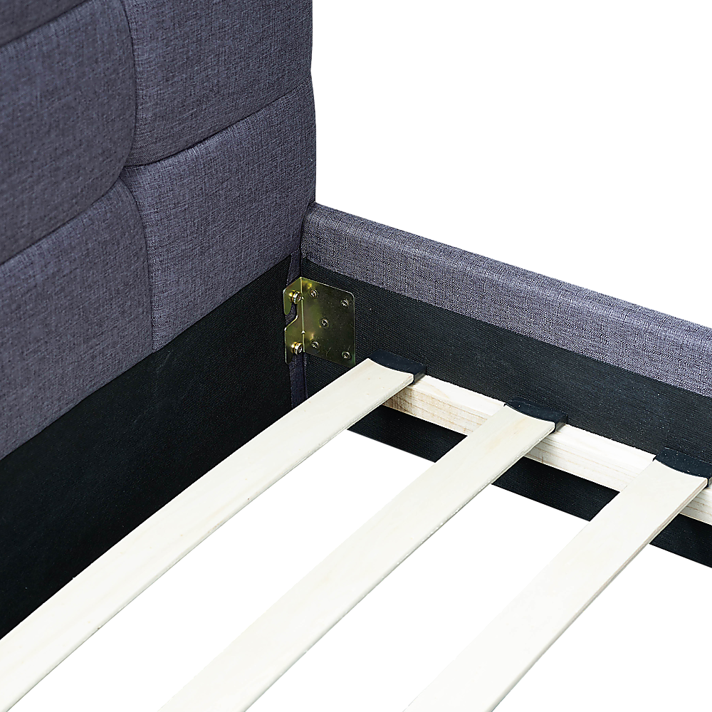 An exceptionally sturdy all-wood frame and support slats provide a rock-solid foundation for your mattress that will surely lead to many restful nights. The Fabric Linen covering is similarly durable, not to mention easy to clean. The frame is designed to accommodate standard queen-sized mattresses with dimensions of 153 x 203 cm (mattress and linens not included). The headboard is 98 cm tall (6cm leg & 92cm headboard) from top to bottom, and the overall dimensions of the bed frame are 206 cm x 162 cm.