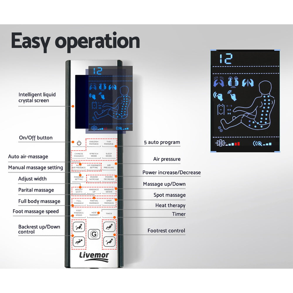 Using the latest smart massage technology, the Livemor Mirna Electric Massage Chair is designed to deliver an out-of-this-world massage experience. A deeply relaxing experience that rivals the professionals, all from the comfort of home. The extensive SL track provides a full body massage that follows the curve of your spine and extends below the thighs, leaving every muscle relaxed. The massage chair also has an automatic body scanning function that maps out the key areas of the neck and back for a consistent massage. Using 5 signature full-body automatic programs, 4 targeted modes, 3 levels of strength and speed adjustments, you can tailor the massage to your exact specifications. Not only that, but you can enjoy ultimate relaxation with a heated massage function, zero gravity position, and built-in Bluetooth speakers to listen to your favourite audiobooks and music. Why pay for the professionals when you can have the luxury of a premium massage in your living room? Get your Livemor Mirna Electric Massage Chair today.