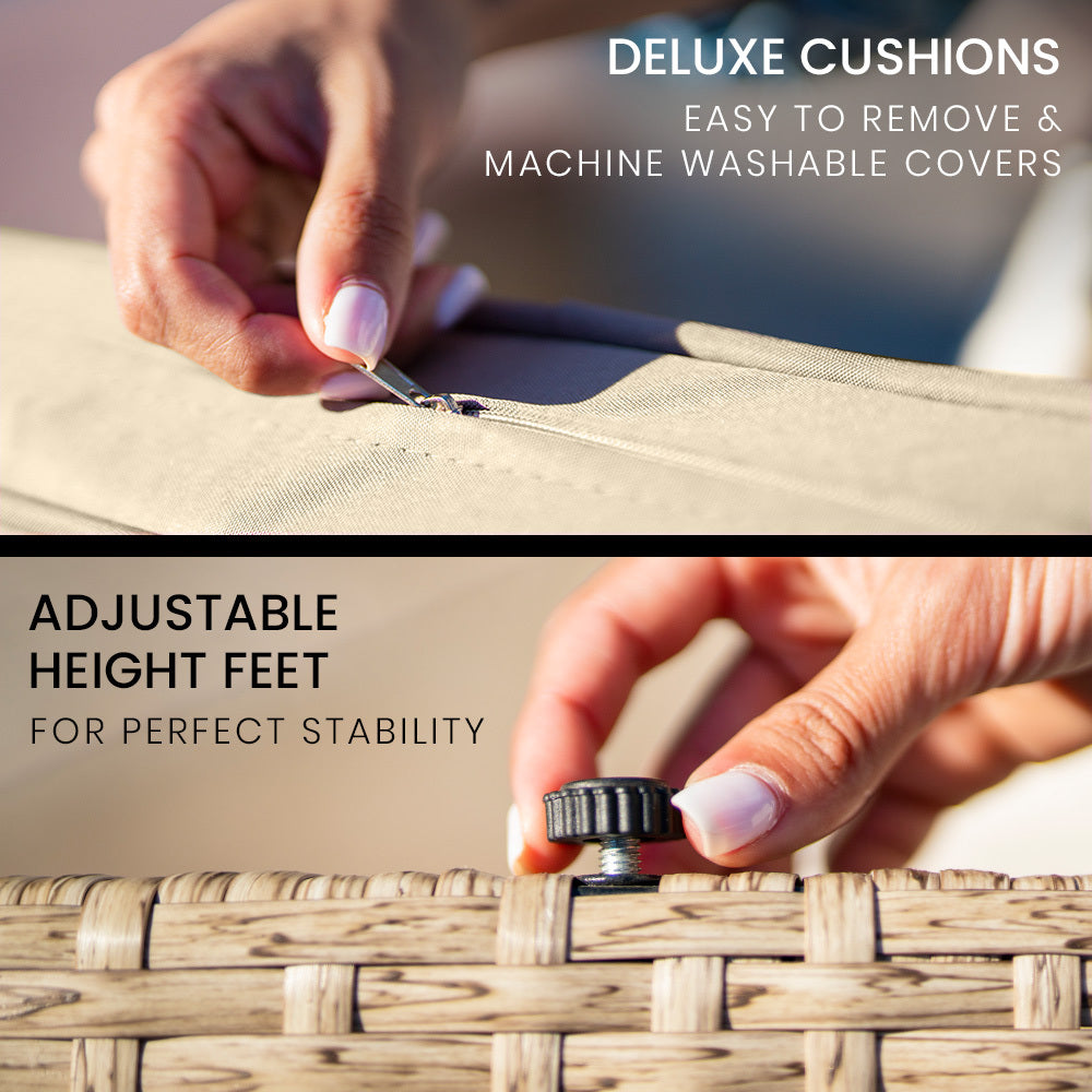 The Noosa Heads Collection Daybed is wrapped in a premium hand-woven SunTech resin wicker with an impressively natural look. The weave material is UV stabilised and up to 40% thicker than most others, ensuring it will continue to look as good as the day you bought it for many years to come. The Daybed features adjustable feet to offer stability and comfort. This 3 piece set can be separated to seat up to 4 adults.