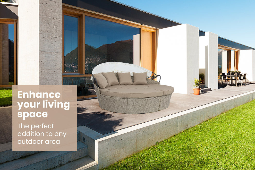 The day bed is fitted with a retractable roof canopy which can be adjusted depending on how much shade you require. This premium piece of outdoor furniture comes with four throw pillows, and is designed to stand the test of time and provide utmost comfort.