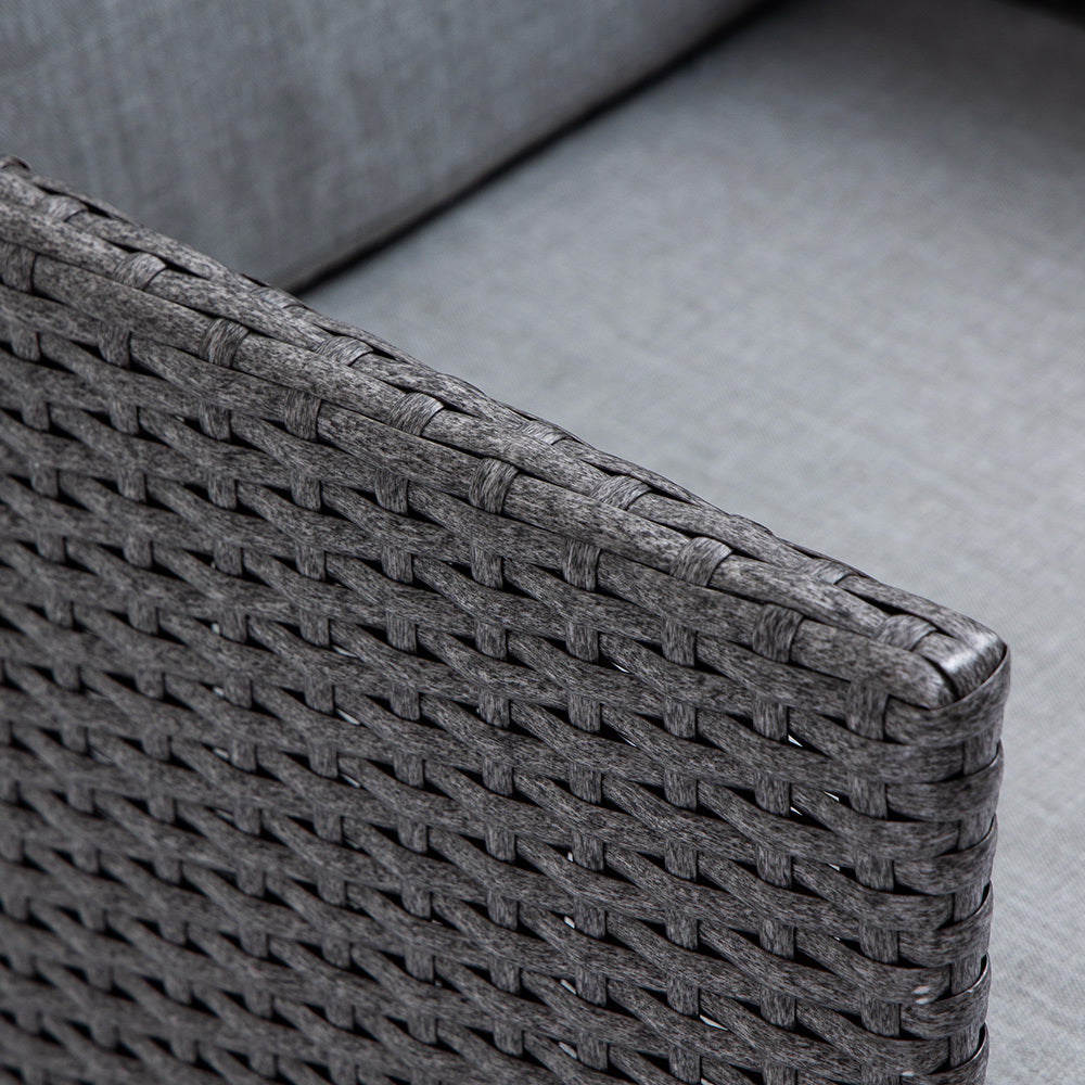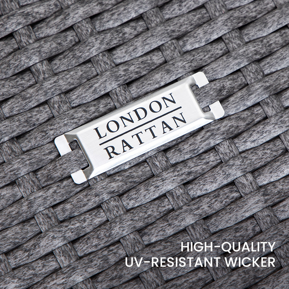 The London Rattan outdoor furniture setting has a durable, rust-resistant powder-coated steel frame and non-marking feet, ensuring no scuffs or rust stains on your outdoor living area.