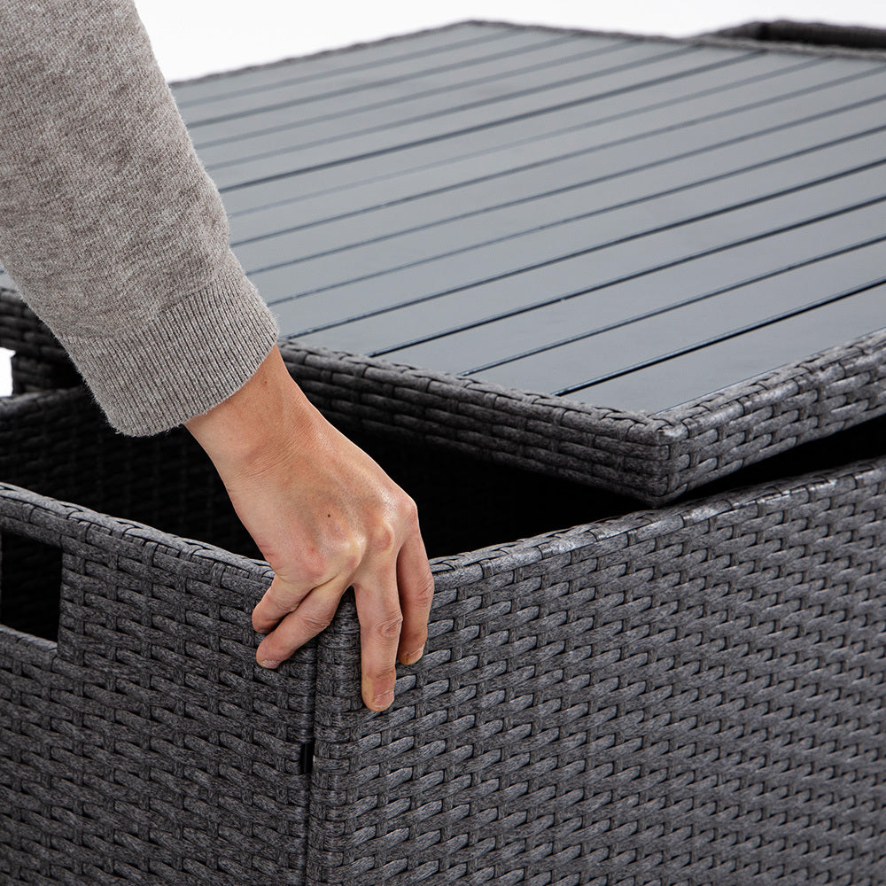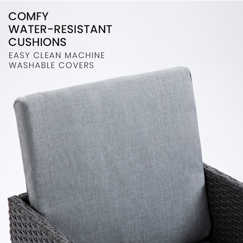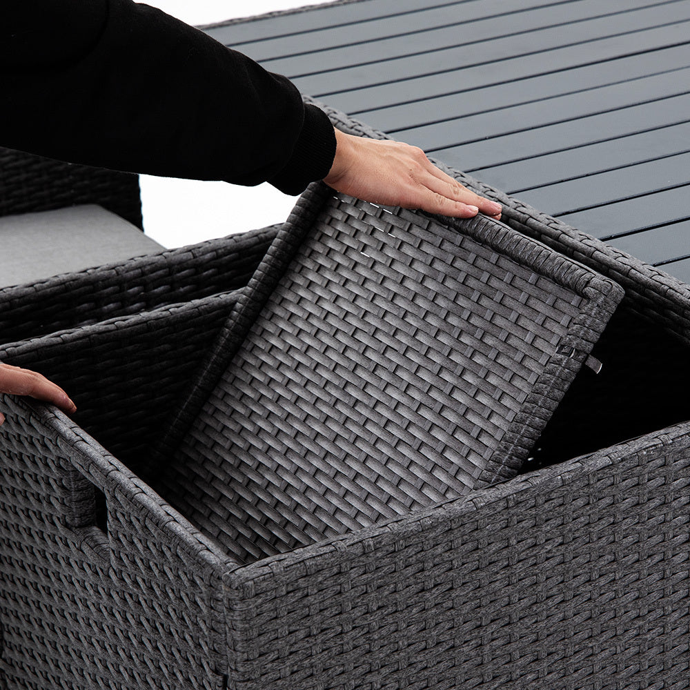 Offering superior UV-resistant Suntech wicker, durable aluminium tabletop, and comfy water-resistant cushions surrounded by high grade machine-washable covers.