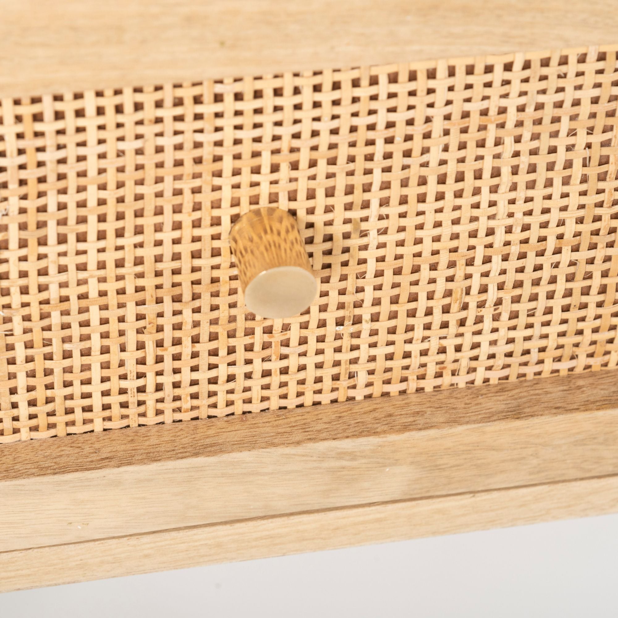 This 1-drawer bedside is a furniture masterpiece displaying the beauty of natural aesthetics. It is a versatile storage case designed in the contemporary style that looks lovely in the bedroom. Made of sustainably harvested mango wood, the furniture piece has gorgeous rattan weave on the drawer front. Mango wood is valued for its robustness, longevity, and resistance to mould or moisture. The full-extension metal runner and brass powder coated metal handle on the sizable drawer adds to the practical functionality of the bedside. Strong metal legs provide a sturdy base for the furniture. Due to natural colour, the furniture piece brings a sense of cosiness and warmth to your bedroom, and it complements diverse interior decor styles or bed designs. The easy-to-assemble furniture comes with a one-year warranty.