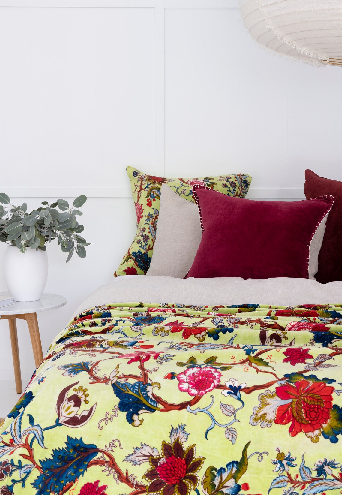 This soft plush velvet throw reverses to equally soft cotton fabric. The light weight throw is precisely made giving each throw a unique texture and tonal look. Reverses to plain cotton fabric at the back. Each throw is pre-washed for a natural and soft look. This cozy cotton velvet throw can be used as a bedspread, coverlet or blanket all year long.