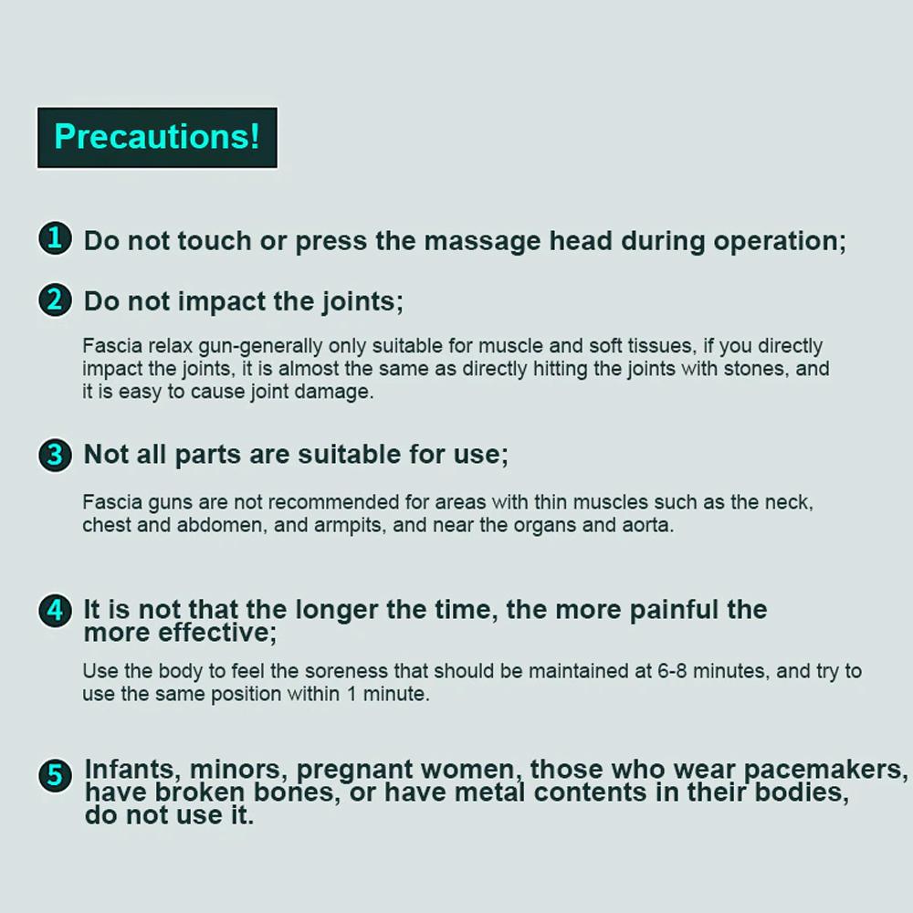 3. Not all parts are suitable for use: for example, neck, chest, abdominal cavity and armpit, where the muscle thickness is thin and close to organs and aorta, fascia gun is not recommended at all.