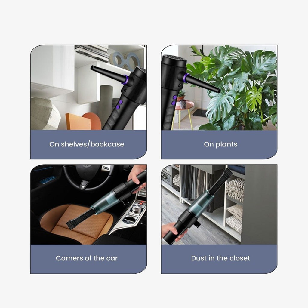 - Two Machines In One: Our tough blower blasts dust into more accessible areas before swooping it up with its powerful suction, clearing the tiny particles suffocating your personal space.