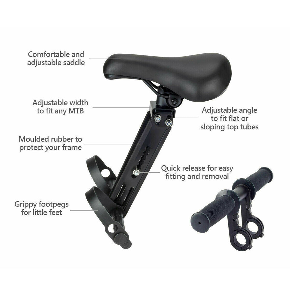 - Fits All Mountain Bikes: The Kids MTB seat is adjustable to fit flat or sloping top tubes. Please note that the bike seat is not suitable for e-bikes, road bikes or older bicycles with cables on the top tube.