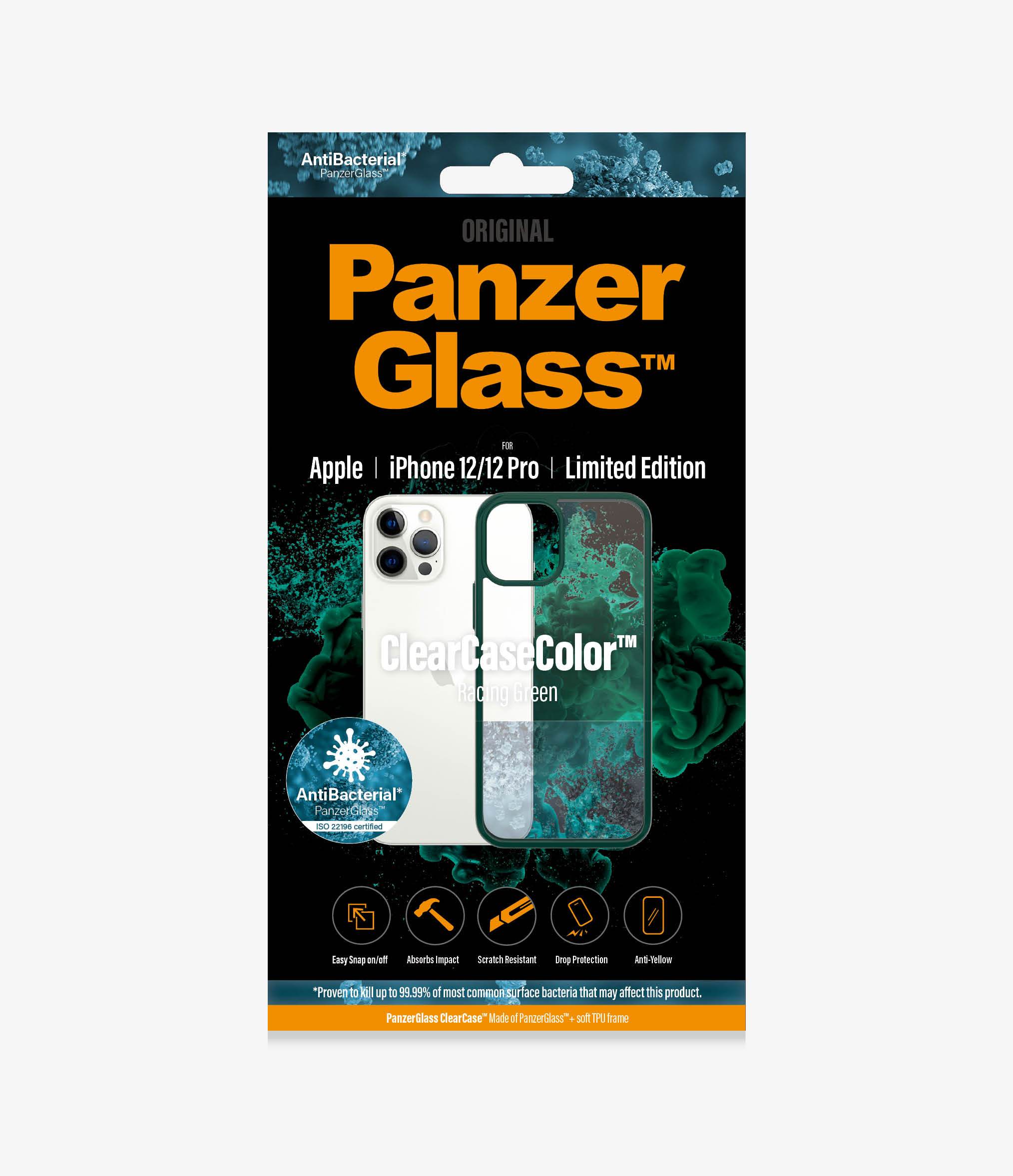 PanzerGlass?äó ClearCaseColor?äóApple iPhone 12/12 Pro - Racing Green Limited Edition (0268) PanzerGlass?äó ClearCaseColor?äó to Apple iPhone 12 and iPhone 12 Pro is the strongest ClearCase?äó from PanzerGlass?äó and protects the beautiful design you paid for. ClearCaseColor?äó Racing Green Edition protects the phone from drops, scratches and dust. Produced with PanzerGlass?äó and an extra strong honeycomb frame. The case matches all buttons etc for easy and full access to all functionalities. Slightly swelling bumpers in all corners to enhance protection. Applying a ClearCase?äó Black Edition does not affect wirelesscharging. Features Most powerful ClearCase?äó ever More than 19% better protecting performance Plastic frame surrounding rear cameras Tempered anti-aging glass back Works w. wireless charging Honeycomb pattern to enhance shock absorption Slim fashionable design Slightly swelling bumpers in all corners to enhance protection