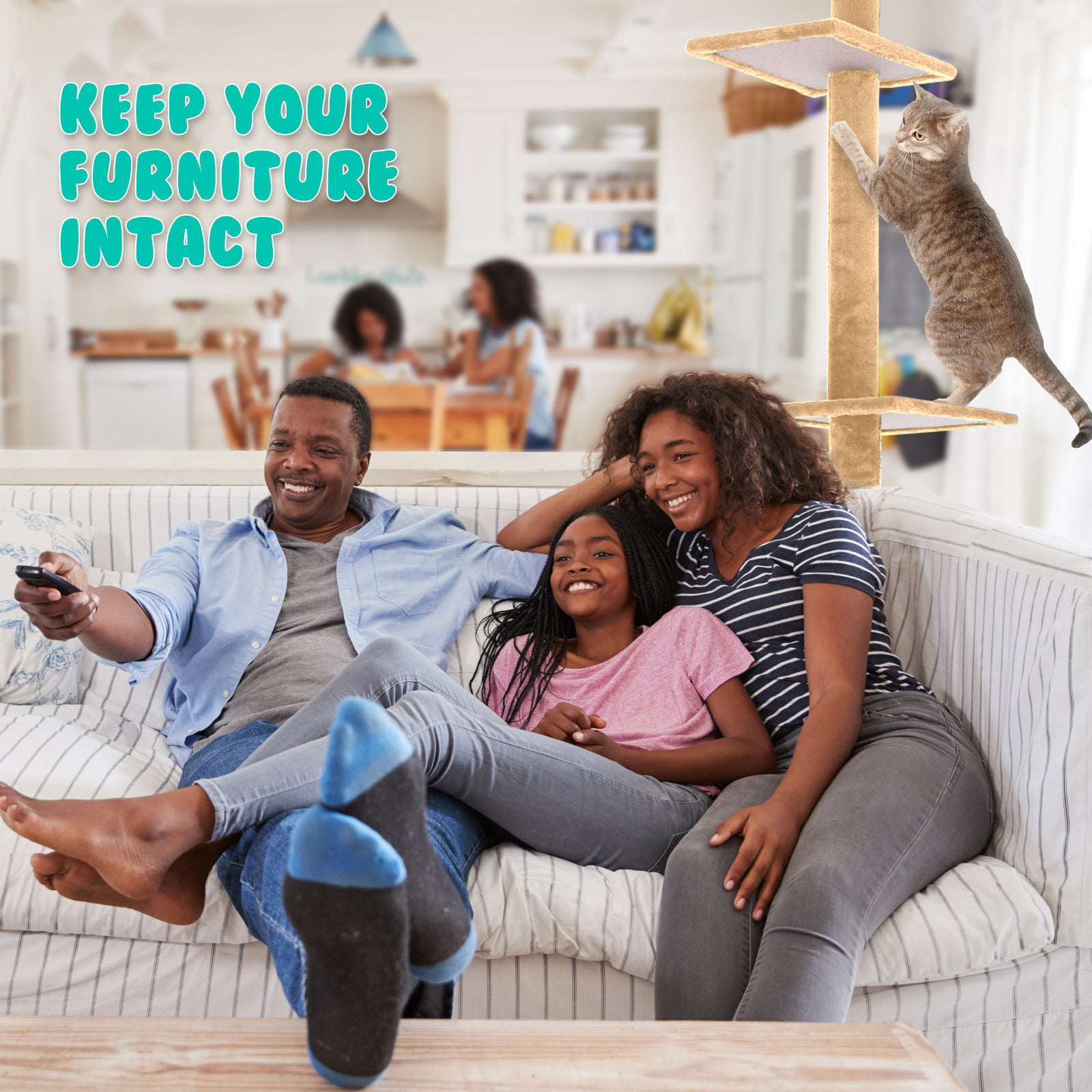 Unlike other fixed-height cat trees, it has an adjustable telescoping rod to fit most of your ceilings (ceiling height from 246cm to 278cm) and the top part is wrapped with a plush covering to protect the wall or ceiling from scratches or damage. No need to worry about finding a cat tree that matches the exact height of your room.