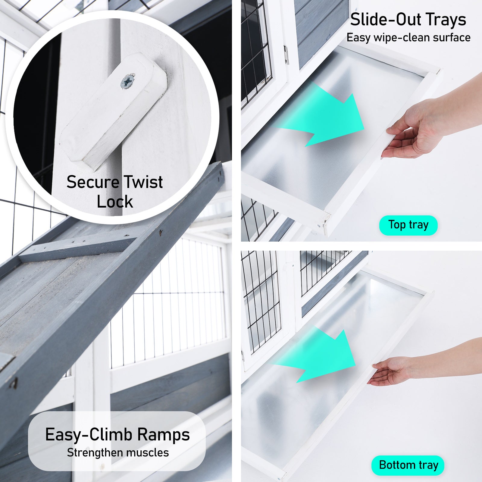 Made from non-toxic fir wood and galvanized mesh wire, our hutch provides a safe and durable space for your pets to rest and exercise. With a double-level enclosure and a ramp to strengthen your pets' muscles, this hutch is designed to meet your pets' needs.
