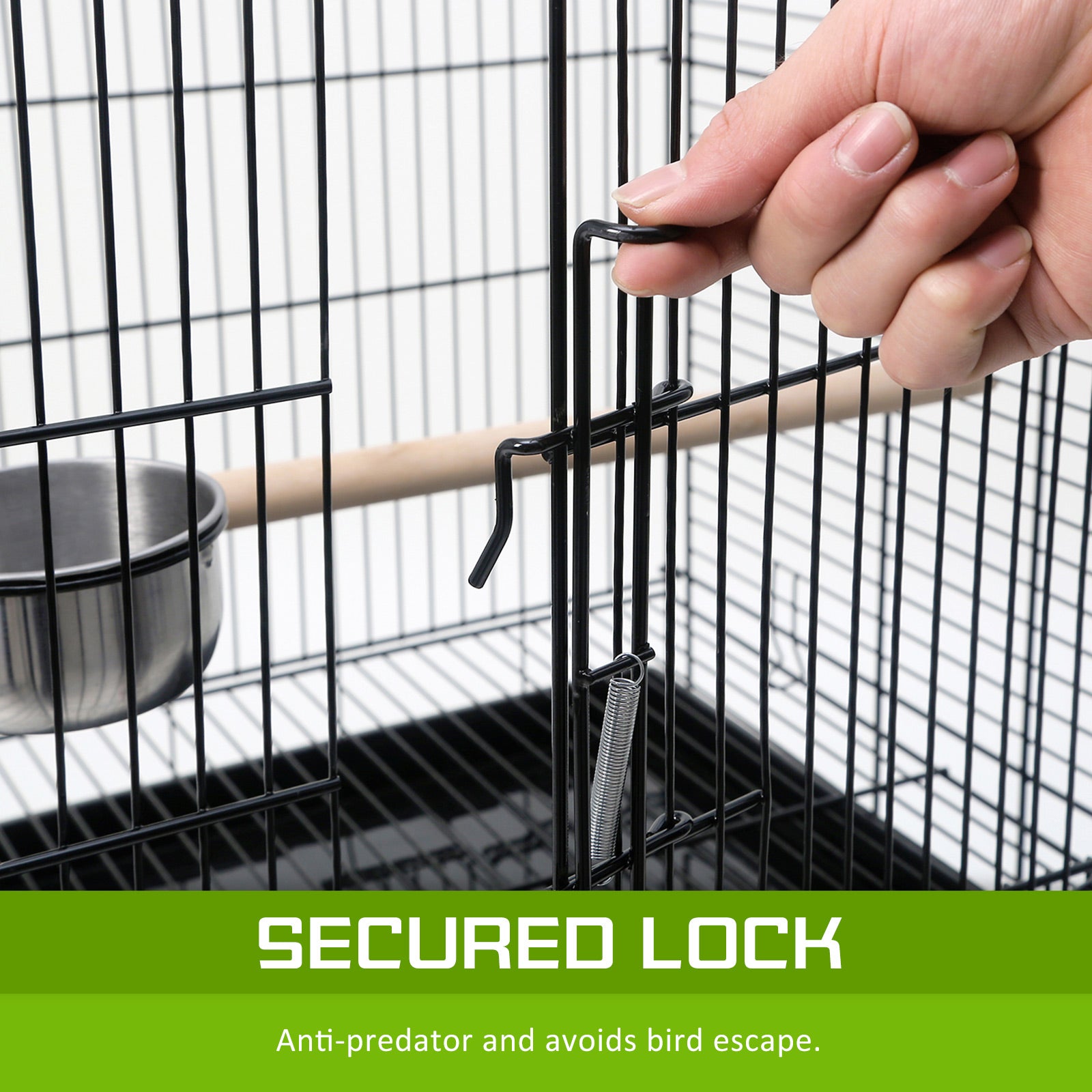 The cage's frame is made of durable and high-quality wrought iron and it is coated with black epoxy in order to prevent it from rusting and offer a longer service life. The top can be opened and closed. There is one large access door and 2 side access windows for stainless steel food/water containers so you can keep your bird safe and have easy access inside the cage and food/water. There is also a removable tray under in order to make cleaning easy. The four, 360 degree swivel caster plastic wheels makes relocating the birdcage very easy. It comes with 2 rest wooden perches.