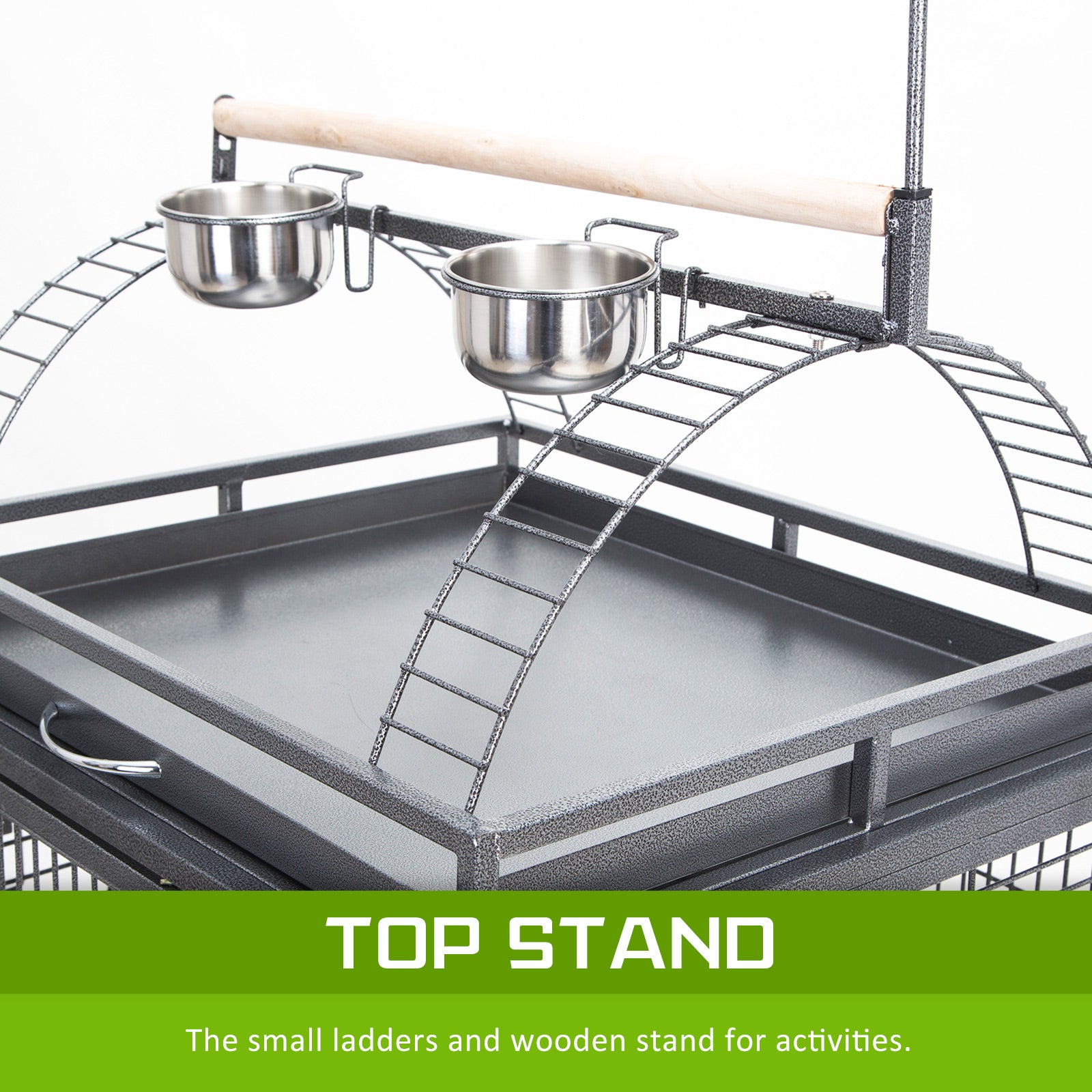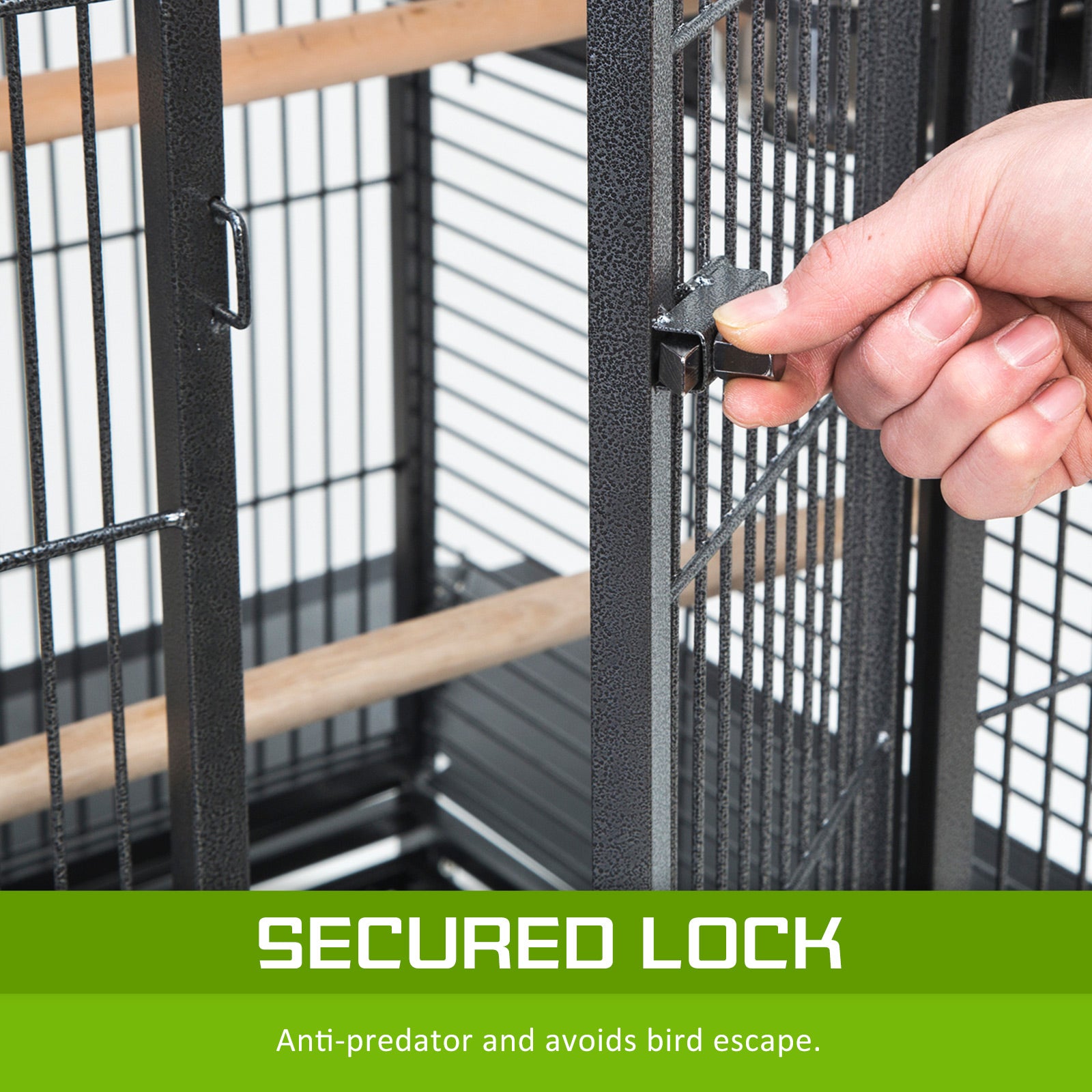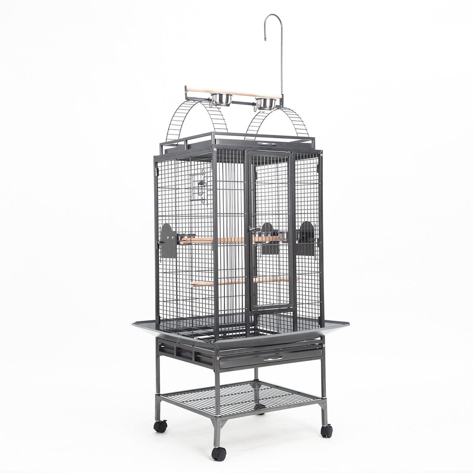 The cage's frame is made of durable and high-quality and heavy duty wrought iron and it is powder coated in order to prevent it from rusting and offer a longer service life. There is one large lockable main door on the front so you can keep your bird safe and have easy access inside the cage. There are also handy quick access doors for the food/water container so you do not need to open the main door to feed your bird. This is a great feature as you minimise the risk of them escaping. There is also a removable tray under in order to make cleaning easy. On the top of the cage, there is a display area where your bird can stand/feed and to make cleaning easier, it is fitted with a removable tray as well.There are four, 360 degree swivel caster plastic wheels so relocating the birdcage is very easy. 5 water/food container and 2 rest wooden perches are included. The cage also has a handy shelf under it so you can store your birds' needs, such as water, food and cleaning tools. Another good feature is that the cage has size waste catch surrounding the cage so when your bird is freely on the edge of the top part of the cage, droppings to the floor can be minimised.
