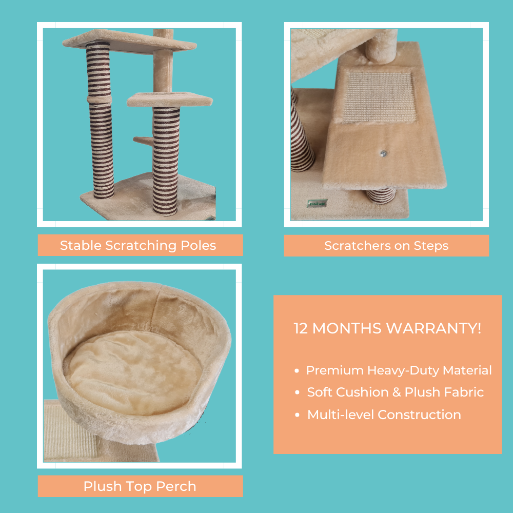 The Petwiz Scratching post is built to satisfy the natural instincts of your precious pet, our Cat Tree include a host of nooks and crannies for Tom and Tabby to have hours of fun scratching, hunting, climbing, jumping, hopping or simply lounging around. Plus, with its sisal-covered scratching posts and steps, you can rest assured that your furniture will stay cat-free for a very long time. Not least, the tree is upholstered with a plush velvety surface for extra comfort and style. Best of all, the firm base and sturdy construction ensures that the tree remain a durable cat haven with total peace of mind for you. Can we hear a meow to that?