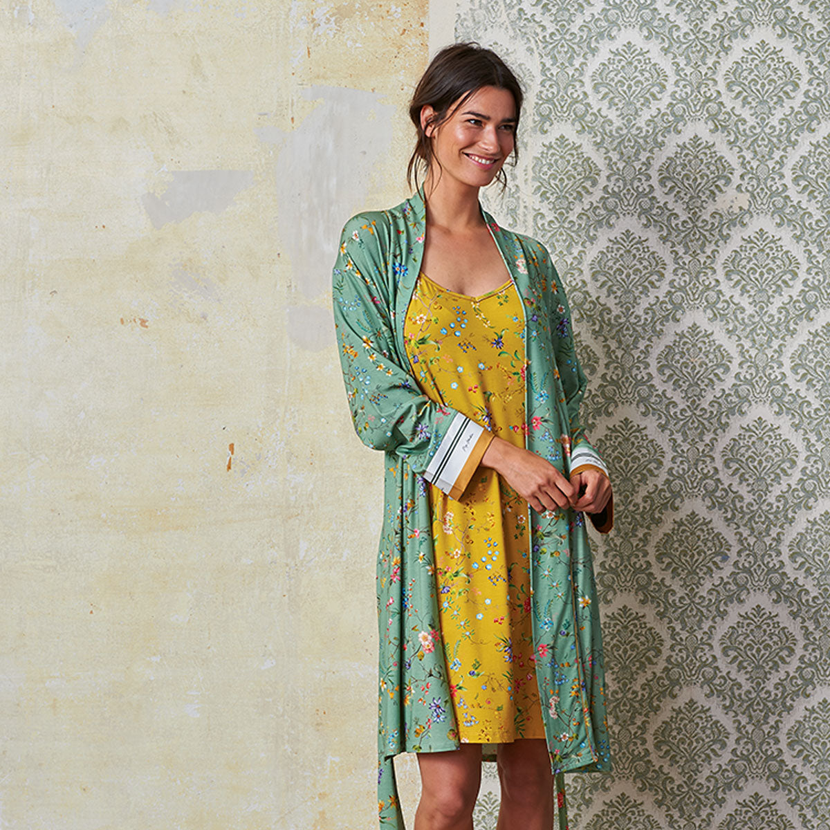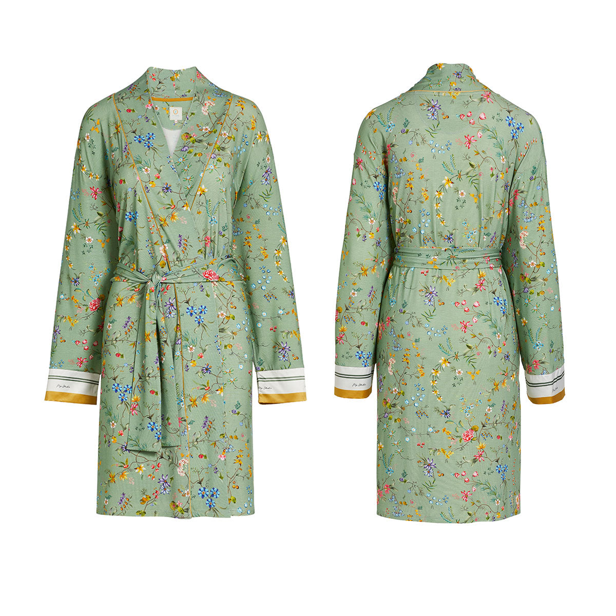 In a colourful mood? This Nisha Petites Fleurs Green Kimono Bath Robe by PIP Studio will make you happy just by looking at it. Imagine yourself in a world full of beautiful flowers. Within this print you will find various flowers such as the Dahlia, Cornflower and some elegant branches. Fresh colours are added on a light green background. Easy to relax in for hours on a lazy Sunday. The yellow finishing touch at the wrists add extra fashionable and timeless beauty. Mix and match with the tops and trousers of our summer collection for a stunning look. Features printed tie belt closure. The bath robe comes in green, yellow, purple, pink, white, and blue colour tones.