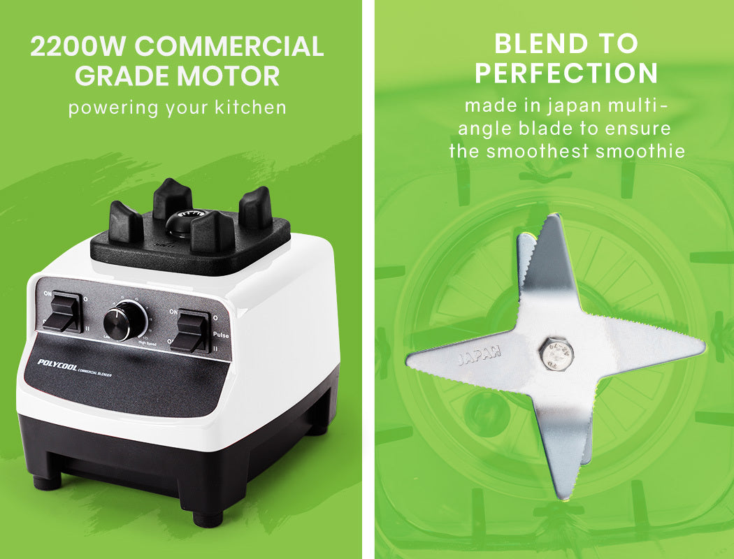 Introducing the PolyCool Commercial Blender - perfect for enjoying the most delicious smoothies at home. With a seriously powerful 2200W commercial strength motor this multi-purpose blender can do smoothies, milkshakes, soups, nut/soy milk, grind nuts or coffee, dips, cocktails, juices and so much more! With a large 2 litre capacity you can blend up cocktails to cater for your next dinner party in seconds!