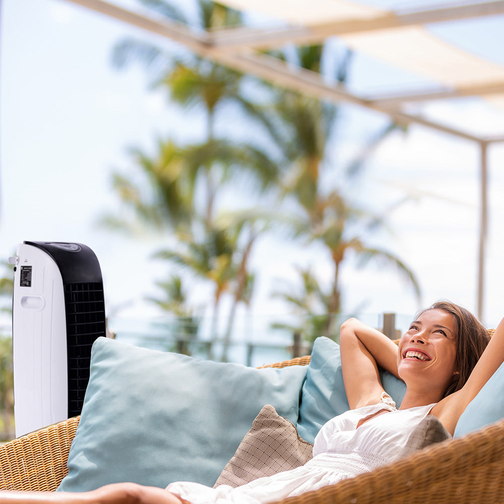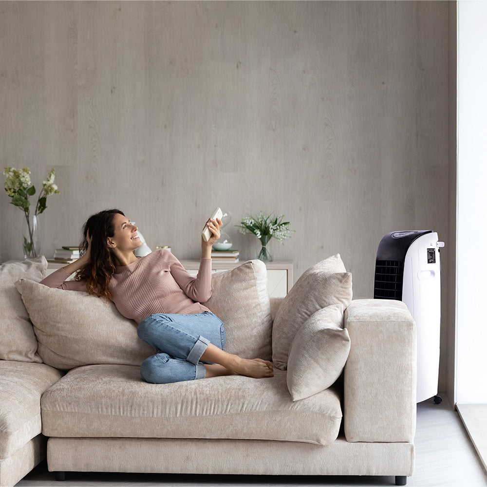 The evaporative cooling process produces cool air by cycling the water, which is up to 6 times more energy efficient than traditional air conditioners! As air is drawn through the filter it gets purified and freshened. You also have the flexibility to position it anywhere as it requires no window ventilation ducting.