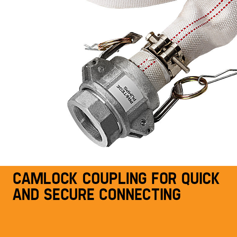 The Protege 36m Canvas Fire Fighting Water Hose is a piece of fire safety equipment you can depend on.  It’s designed exceptionally strong with 1.5†diameter woven lay flat canvas providing 290 PSI rated pressure.  This fire hose offers you peace of mind as an added measure of fire protection for your workplace, home or property.  Couple with a water pump or mains pressure and you have a heavy-duty fire fighting tool that allows you to extinguish the threat 36 metres from the point of attachment.  It features camlock couplings for quick and secure connection, adjustable jet/fog fire nozzle to control output pressure, high-quality alloy fittings for long-term protection from harsh environments, and a brass outlet nozzle connection.  This simple and affordable fire security solution is a common sense investment to help protect the valuable people and assets in your life.  Put your mind at ease and get the Protege 36m canvas fire fighting water hose today!