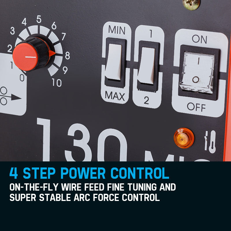 The Rossi MIG 130A Welder is loaded with features including 4 Step Power Control, Fine Tuning On-the-fly Wire Feed, Overheat/Over Current/Overload Protection and an impressive Duty Cycle - This is the MIG welding package for every tradesman!