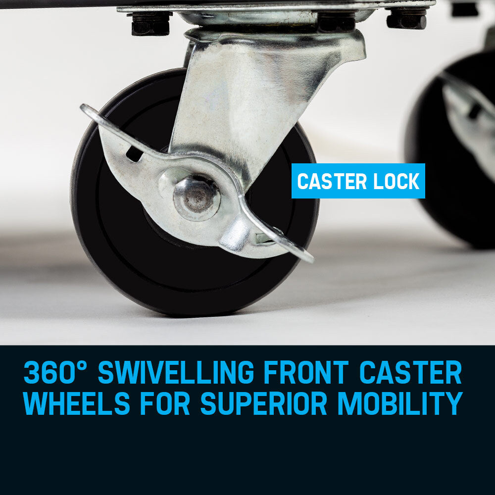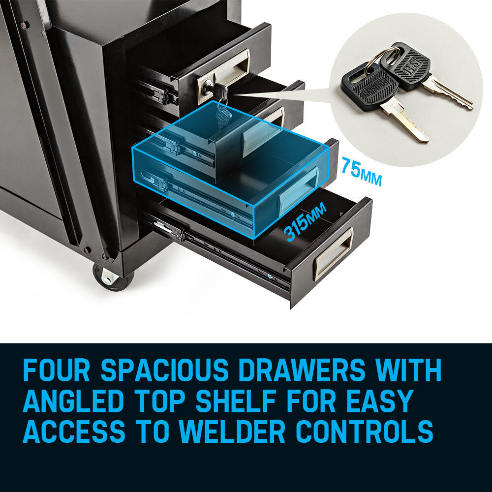 In search of the perfect weld, you should forget all worries behind and steady your hand. The Rossi Deluxe makes sure you can. With four storage drawers and twin hooks there's plenty of space for the welding unit, wires, rods, mask, tungsten nozzles and everything else that's required for a successful fusion, you can focus entirely on the work at hand. And you can work quickly, too; thanks to its solid-rubber rear wheels and nimble 360° swivelling front wheels with brake, your Rossi Deluxe is a breeze to move around the workshop.