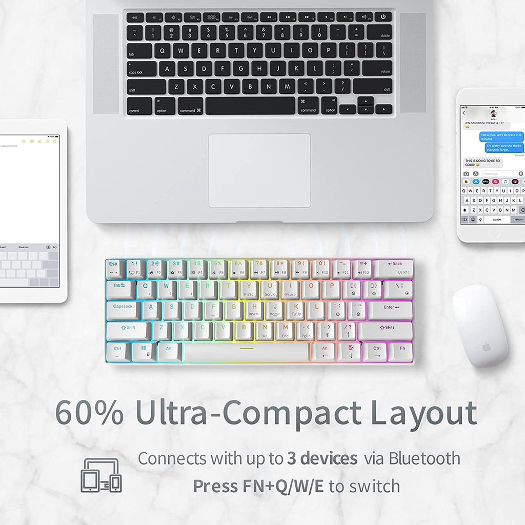 This is a RGB backlight mechanical keyboard with 61 keys. It supports 2.4 Ghz and Bluetooth Wireless/Wired Dual Mode Connections to the device and Compatible with Windows/Mac OS/Android. It has various application designs, such as All Keys Without Conflict, brilliant color Backlit and control of hardware Backlit.