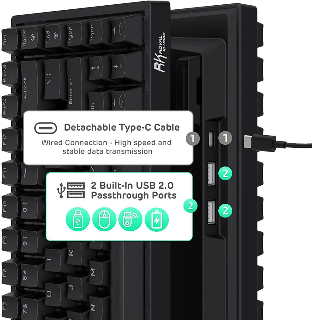 This wireless mechanical keyboard is armed with 2 built-in USB pass-through ports and 1 Type-C Port, allowing to back up more facilities.