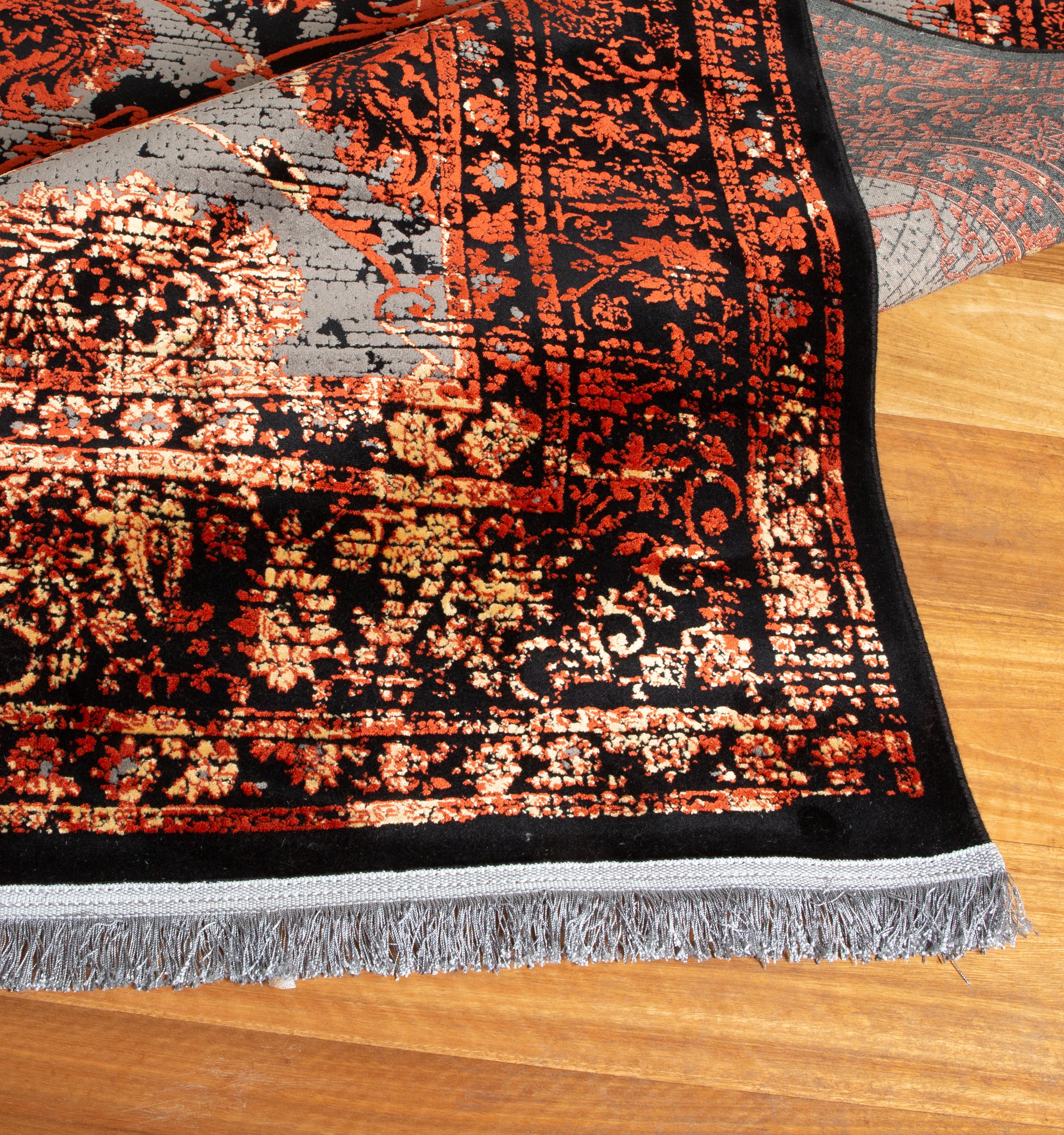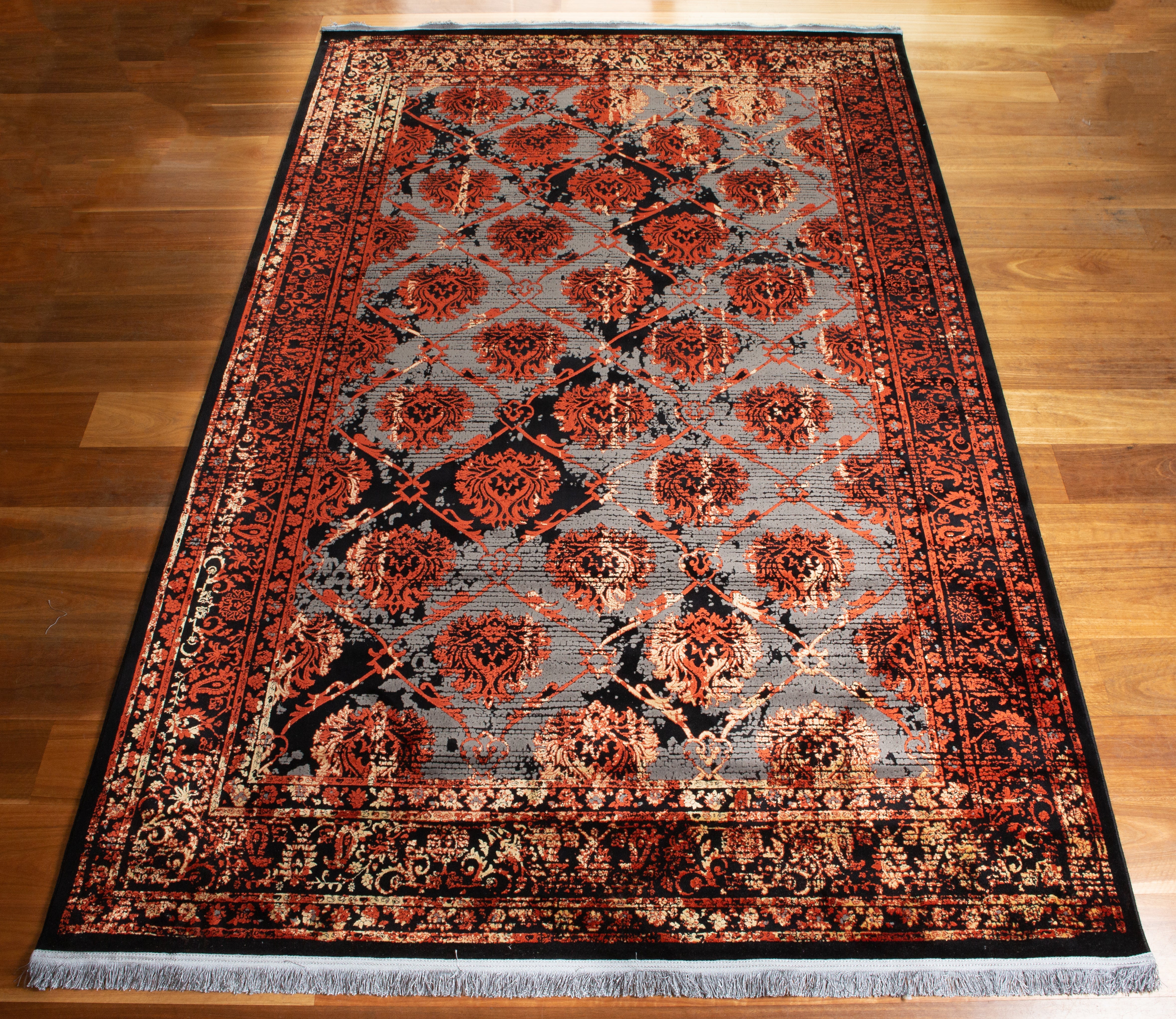 A gorgeous vintage design rug with floral and fiery patterns of rose-red and gold, blossoming on the neutral blue-gray and black undertones of the rug. This bold and royal design is elevated subtly from the rug, giving the patterns a three-dimensional texture that amplifies the rug’s beauty tenfold. Despite being machine-made, Safara retains an authentic hand-made look.