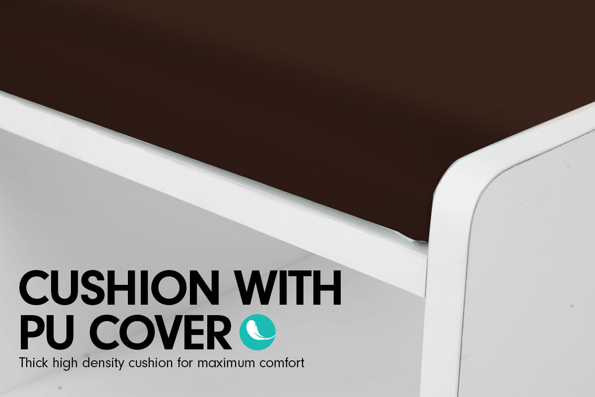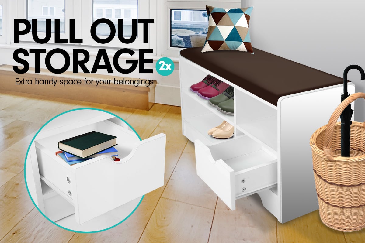 Eliminate the appearance of clutter and create a neat, organized space with this shoe cabinet with padded bench.