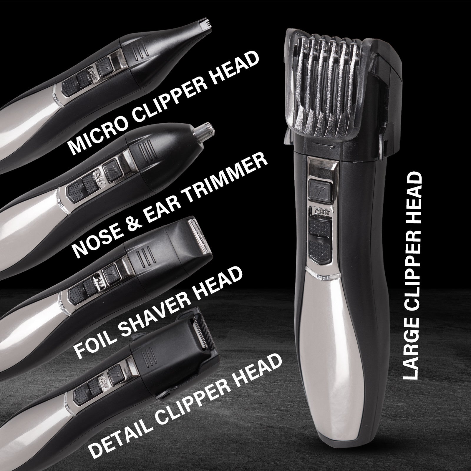 The kit includes seven unique attachments suited for your head, beard, nose, ears, and other hard-to-reach places.
