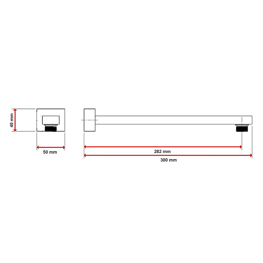 This attractive accessory for your shower has the following dimensions: base plate: 40 x 50mm; length of arm: 282mm; and, length from base to tip: 300mm.