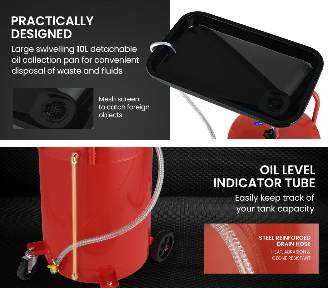 It features a large 10L detachable swiveling oil collection pan with a mesh screen to catch any foreign objects. A telescopic lifting shaft that easily adjusts in height from 98cm right up to 164cm. This allows the commercial-grade T-REX to be easily positioned under the car, as well as being suitable for use in a variety of other automotive workshop applications.