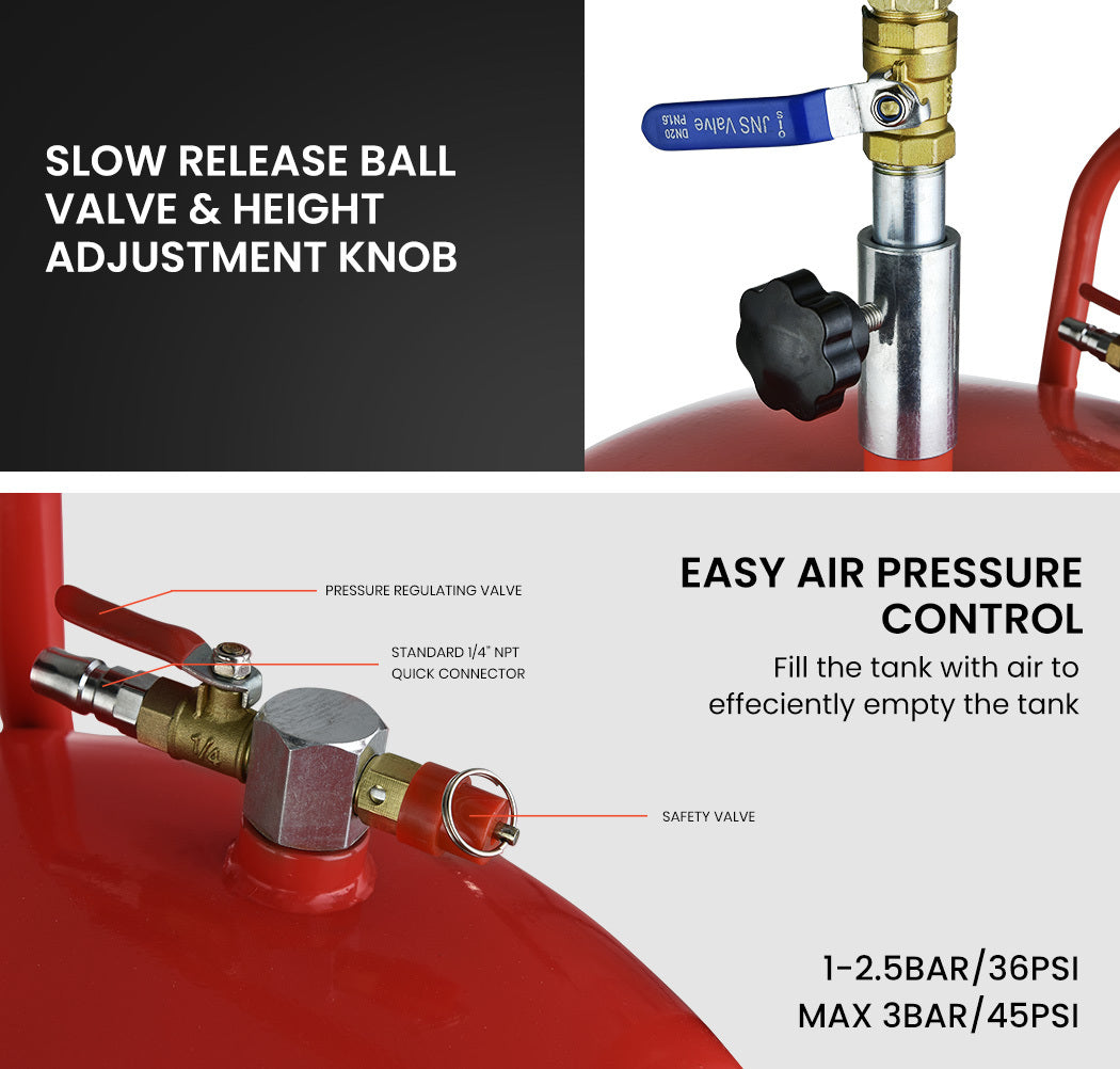 A built-in oil level indicator allows you to easily keep track of your tank capacity, and its steel wire reinforced drain pipe is abrasion, heat and ozone resistant. And, when you’re done, simply connect an air compressor via the standard ¼' NPT fitting to efficiently push out the waste oil.
