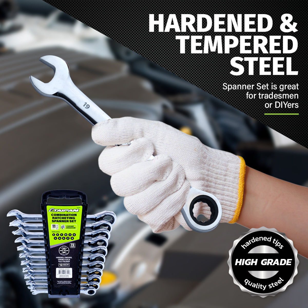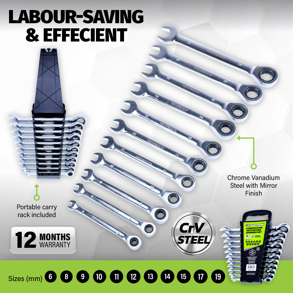 Taipan An impressive 11 piece ratcheting spanner set containing an assortment of sizes for various uses. Featuring premium quality chrome vanadium steel parts, this exceptional set has its own organiser to keep all 11 pieces together when stored. A functional and convenient set for any toolbox.